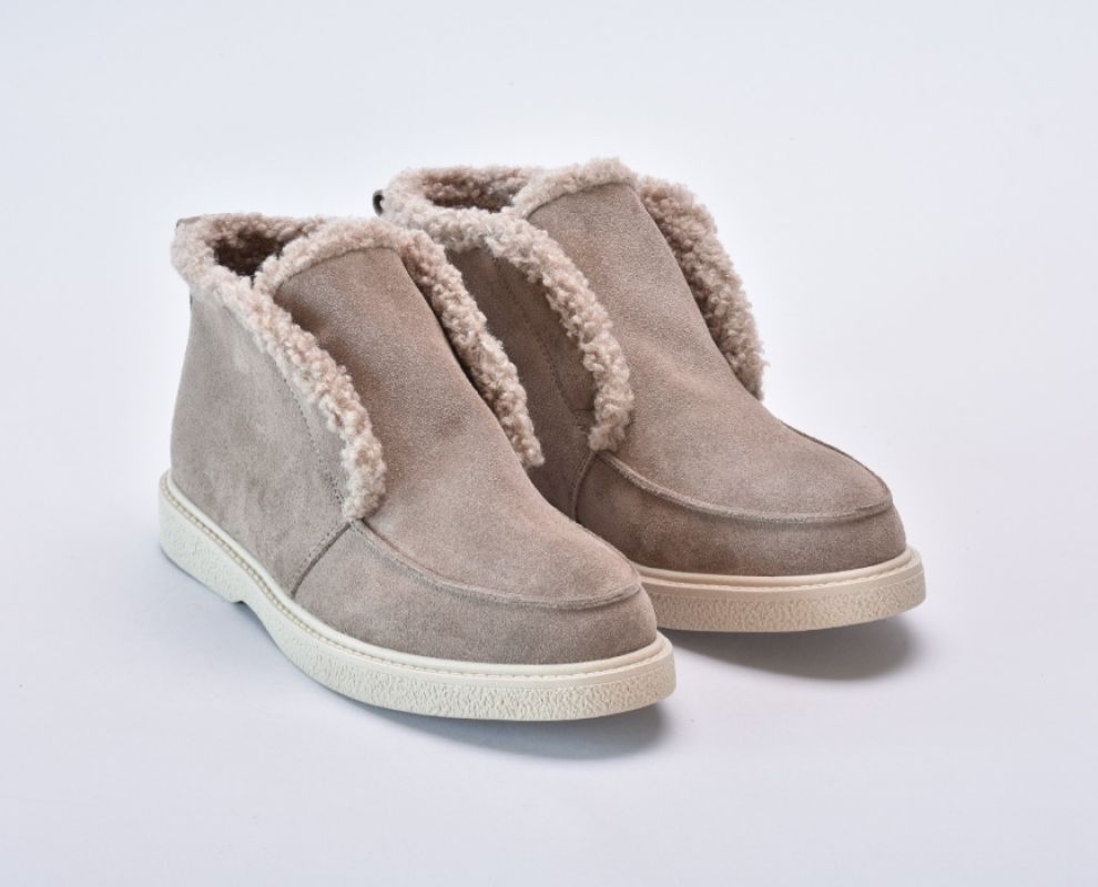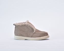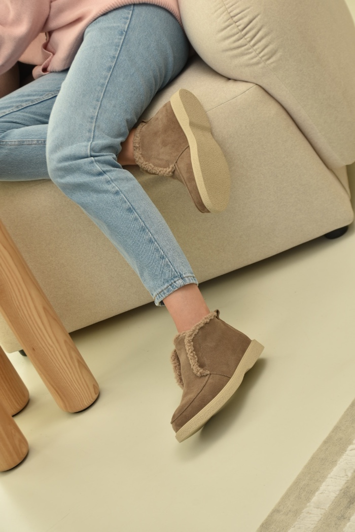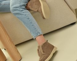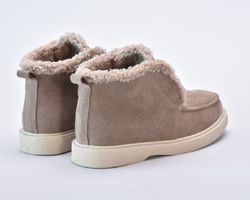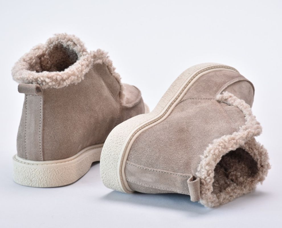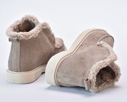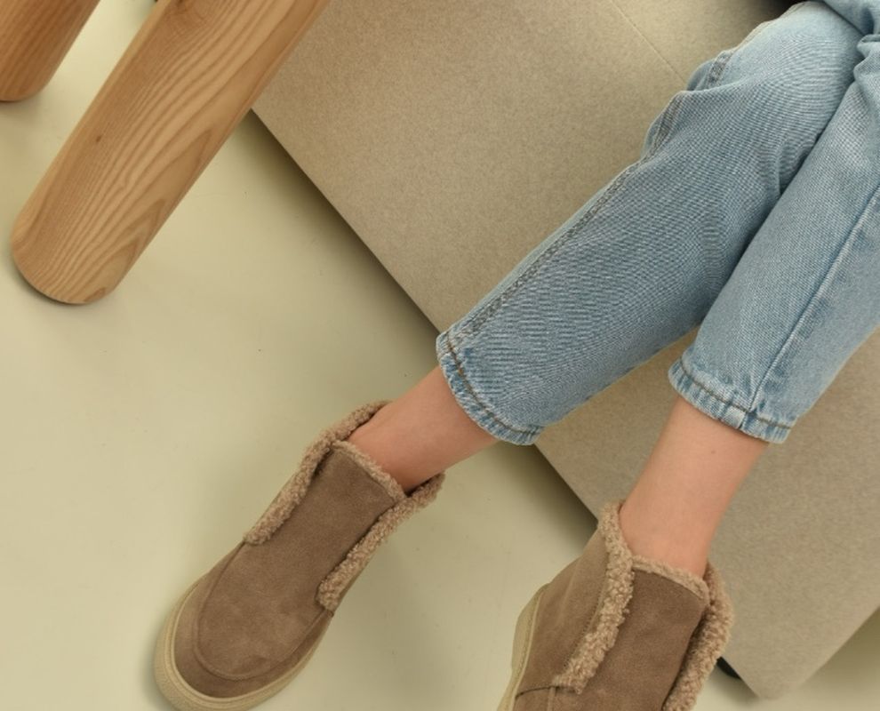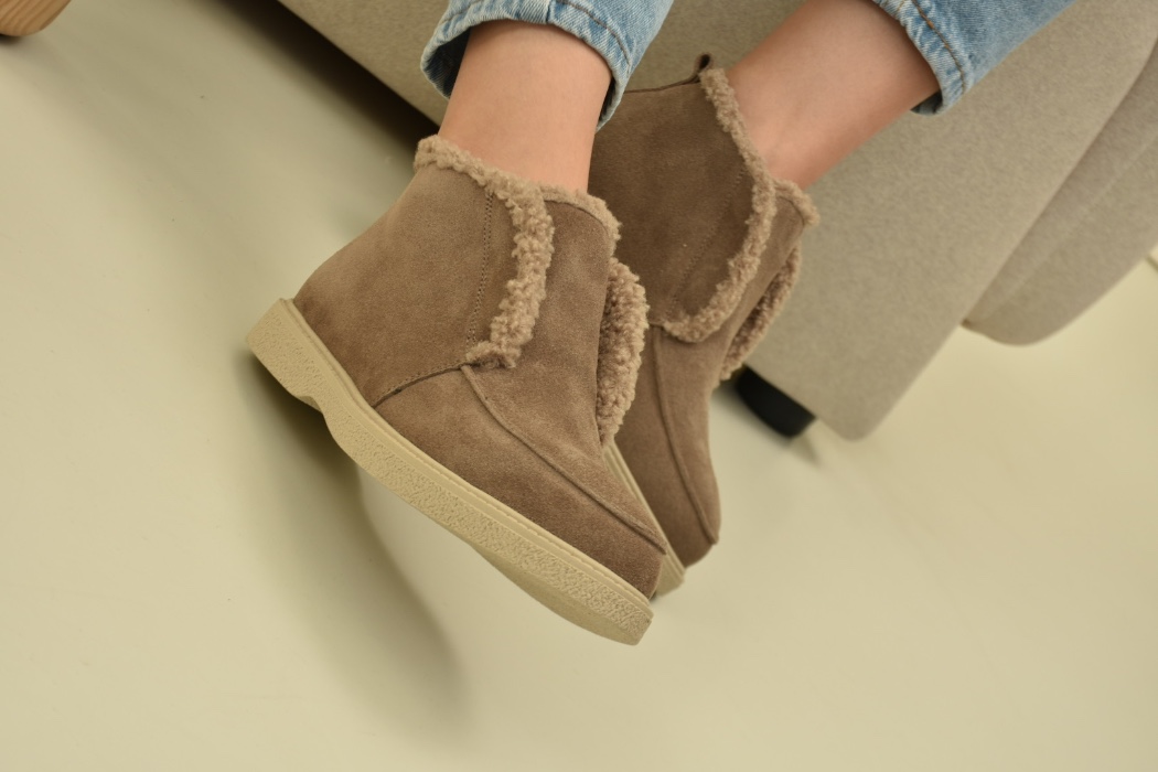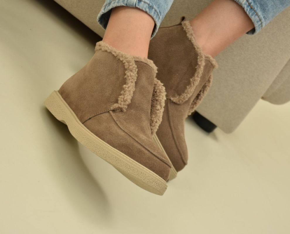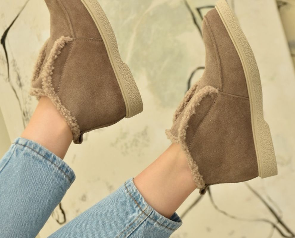 Ця пара дозволить вам експериментувати та створювати різноманітні образи — від повсякденних до ошатних.Виконані з натуральної якісної замші бежевого кольору ,утеплені і декоровані штучним хутром.