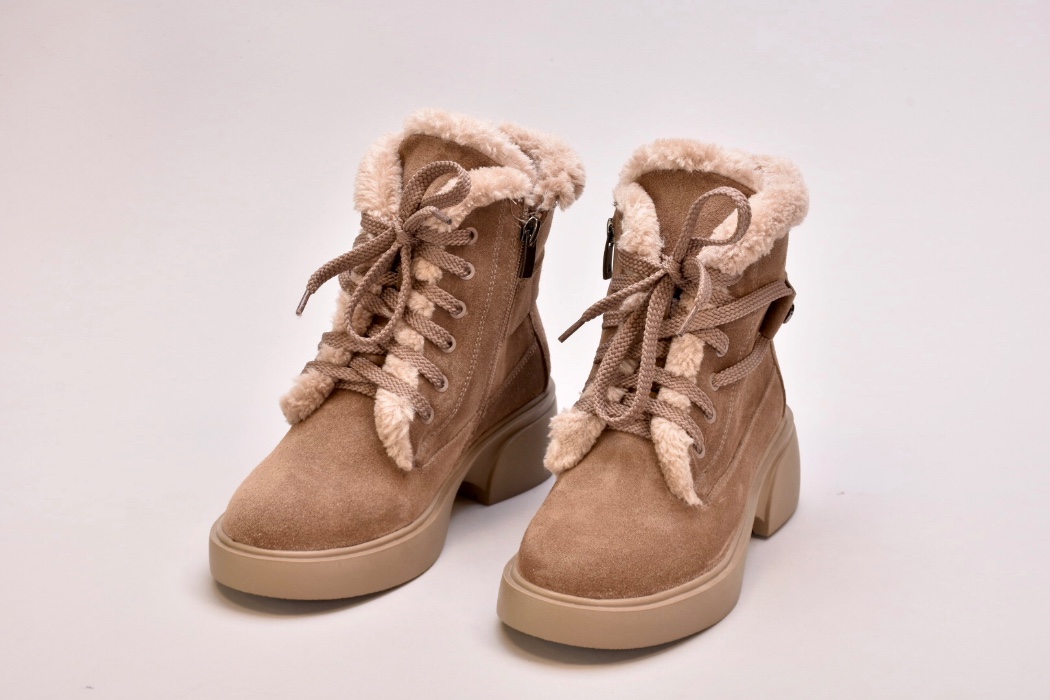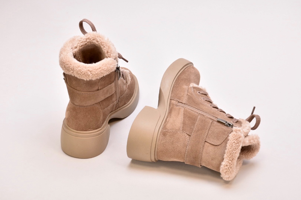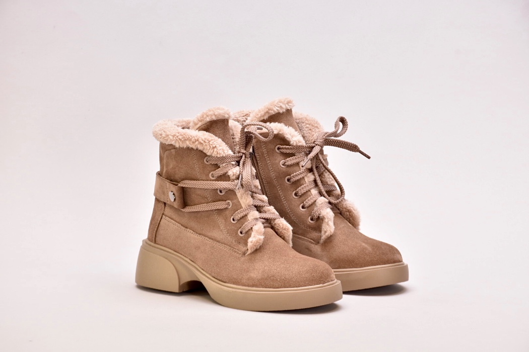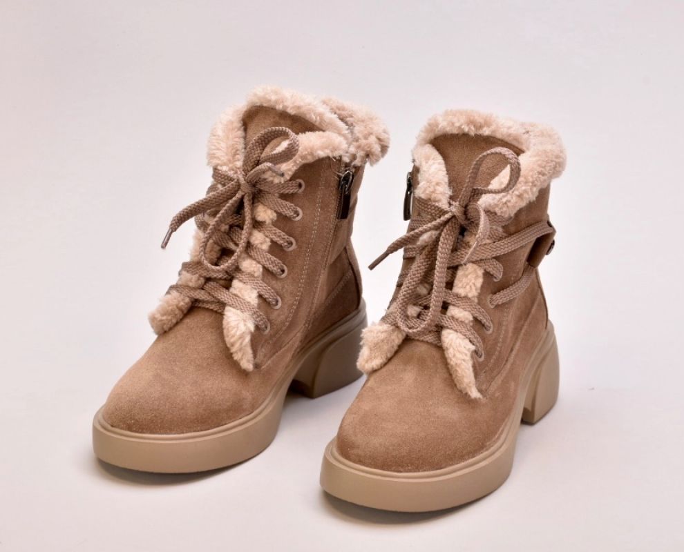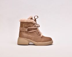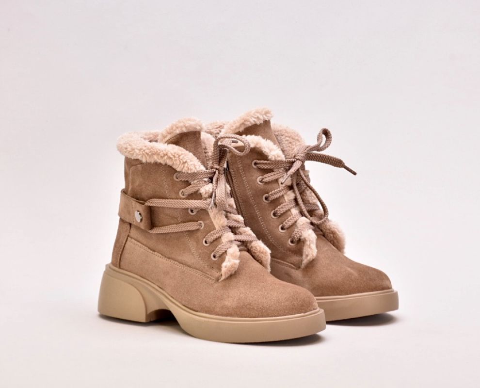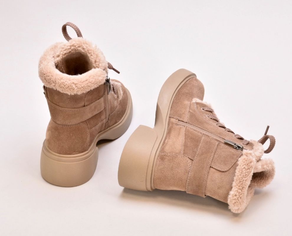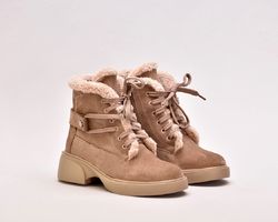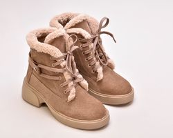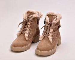 Черевики виготовлені з ніжної бежевої натуральної замші ,оснащені шнурівкою для фіксації підйому,збоку мають блискавку.