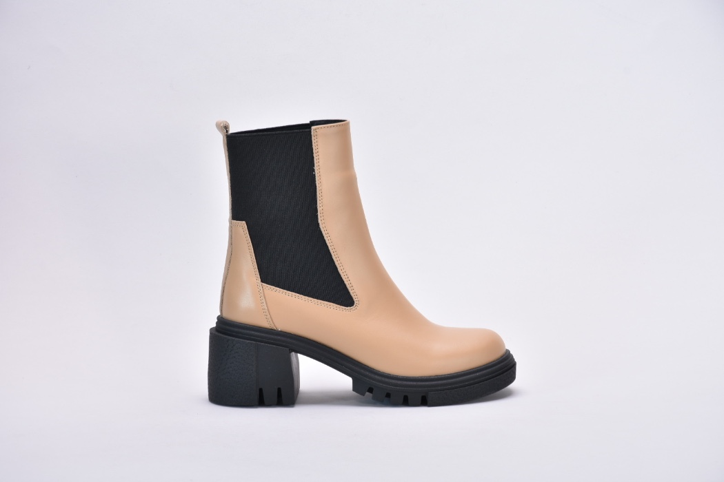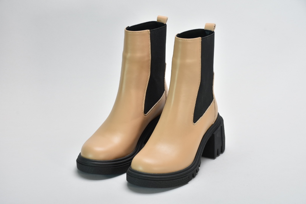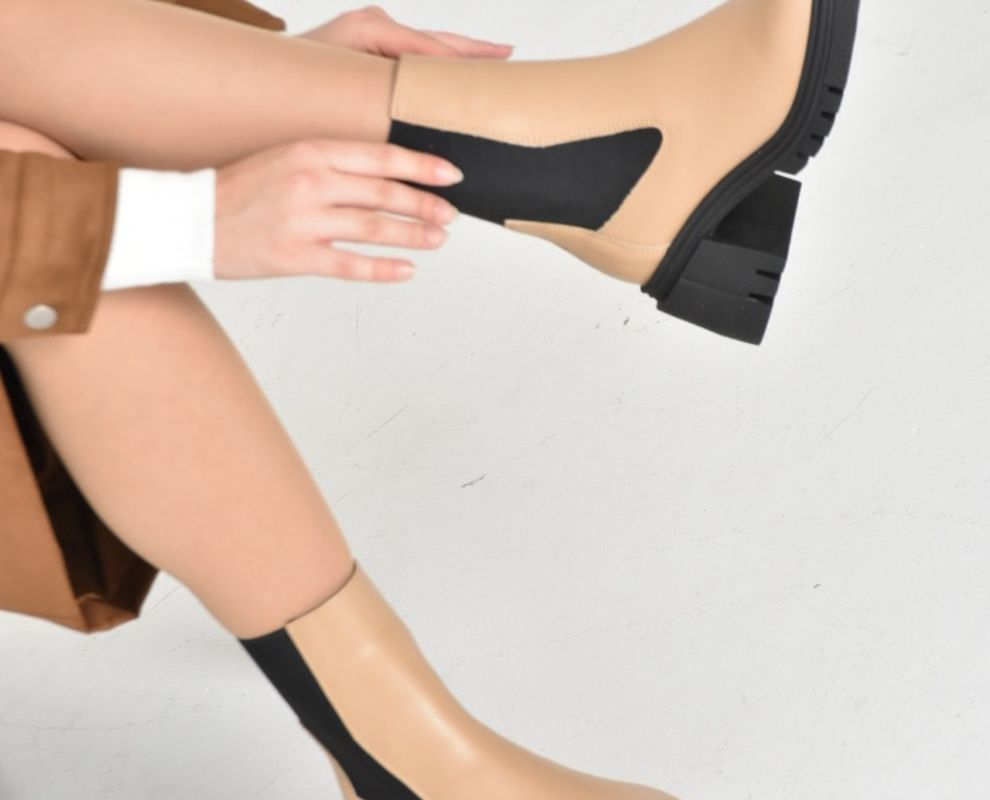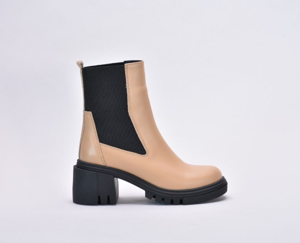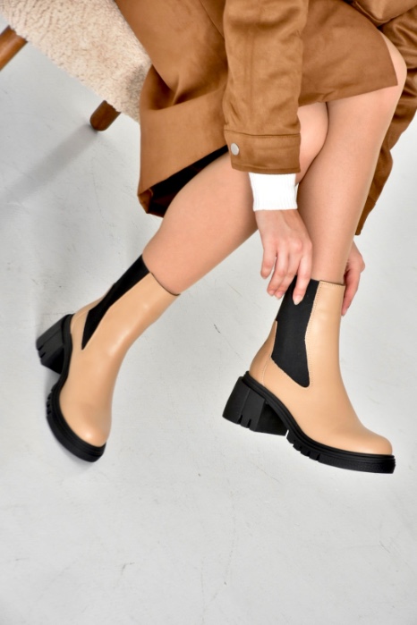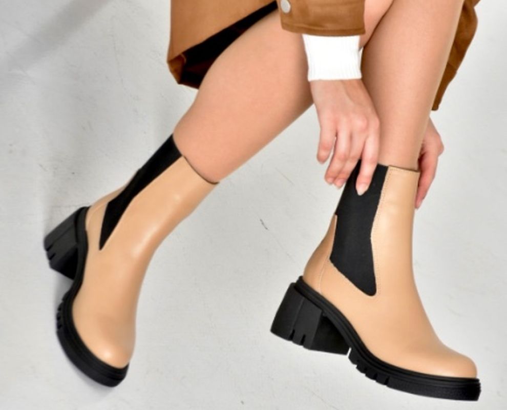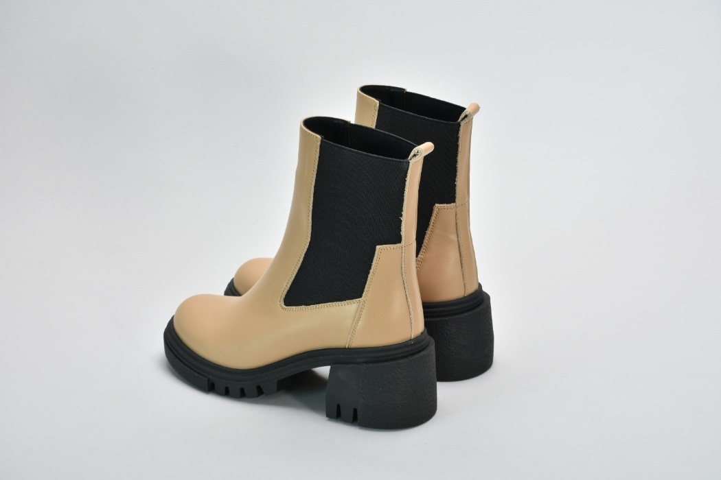 Черевики демісезонні челсі на підборах 6 см виготовлені з м'якої натуральної лицевої шкіри ніжного карамельного кольору , мають чорні еластичні вставки збоку для легкого надягання та знімання.