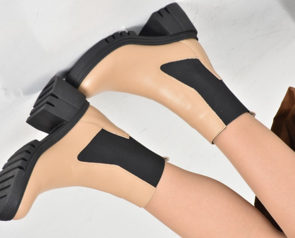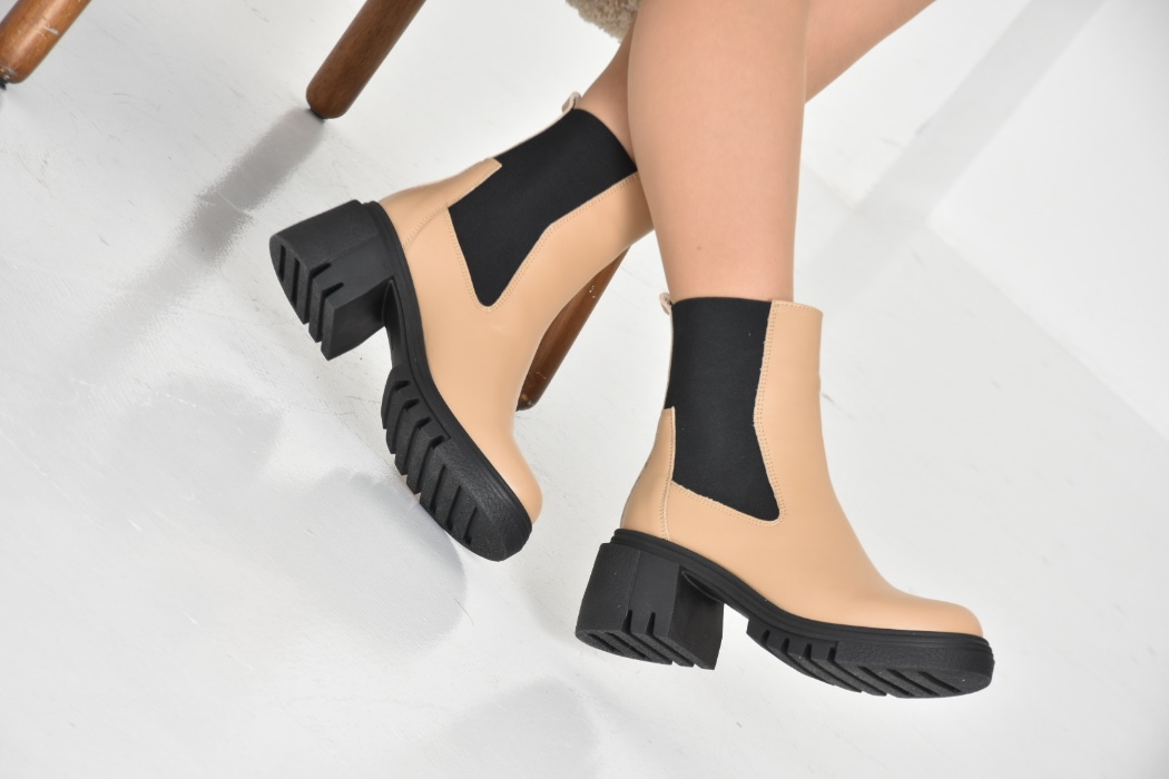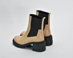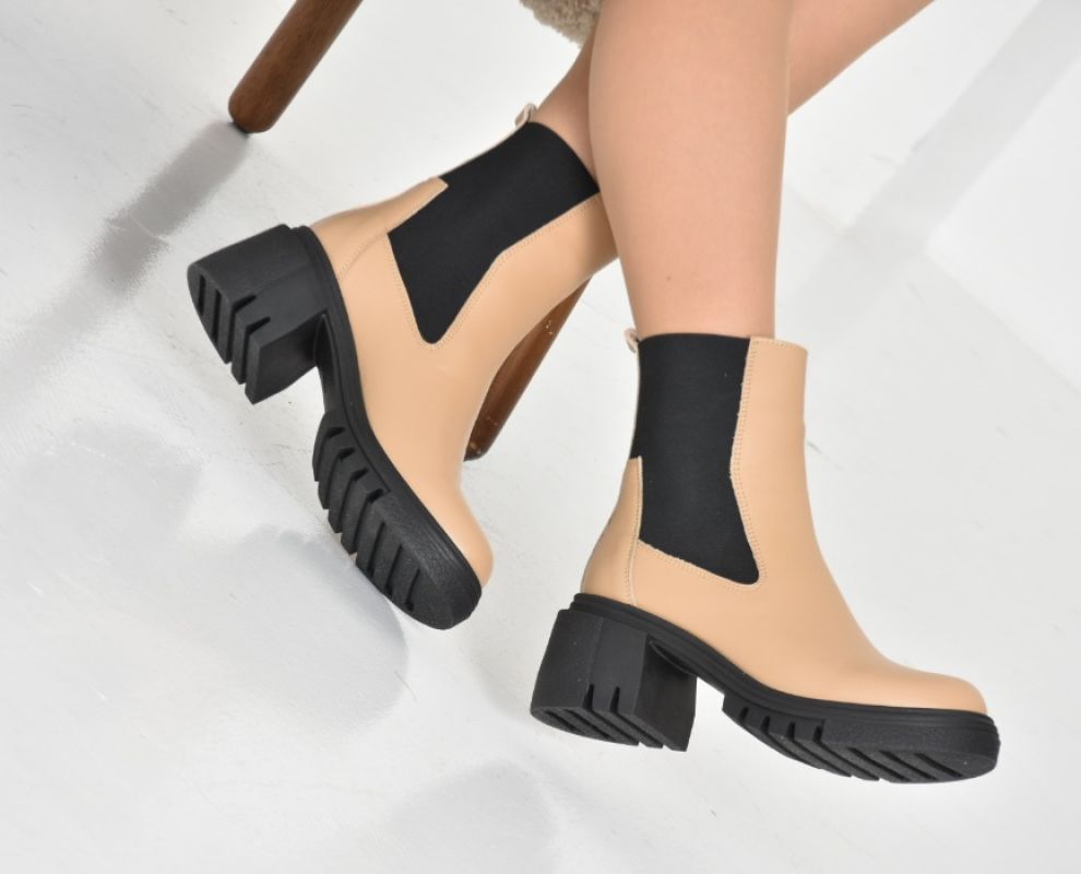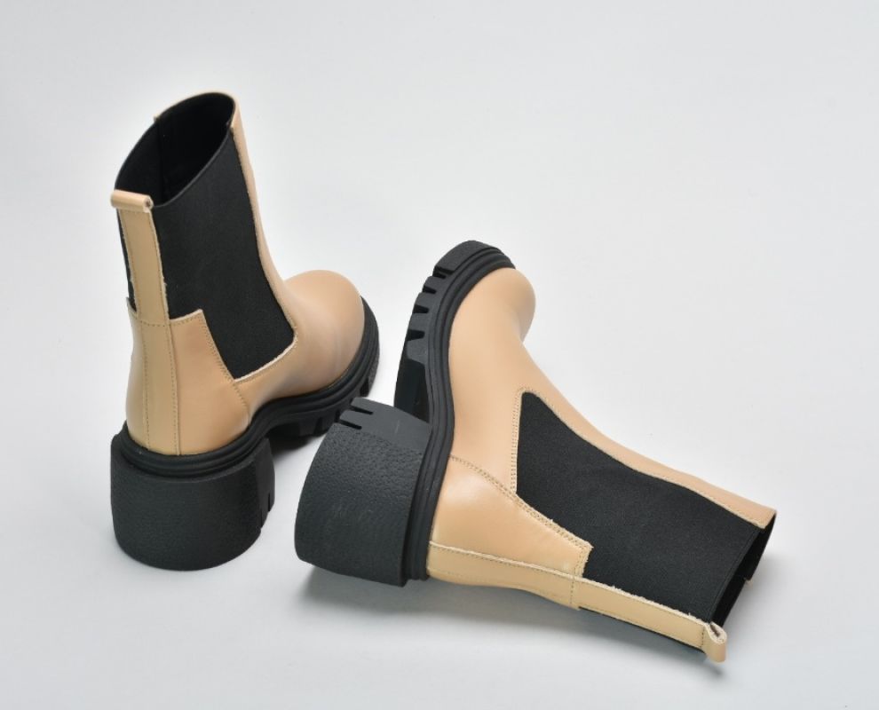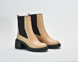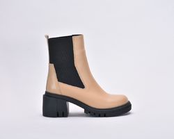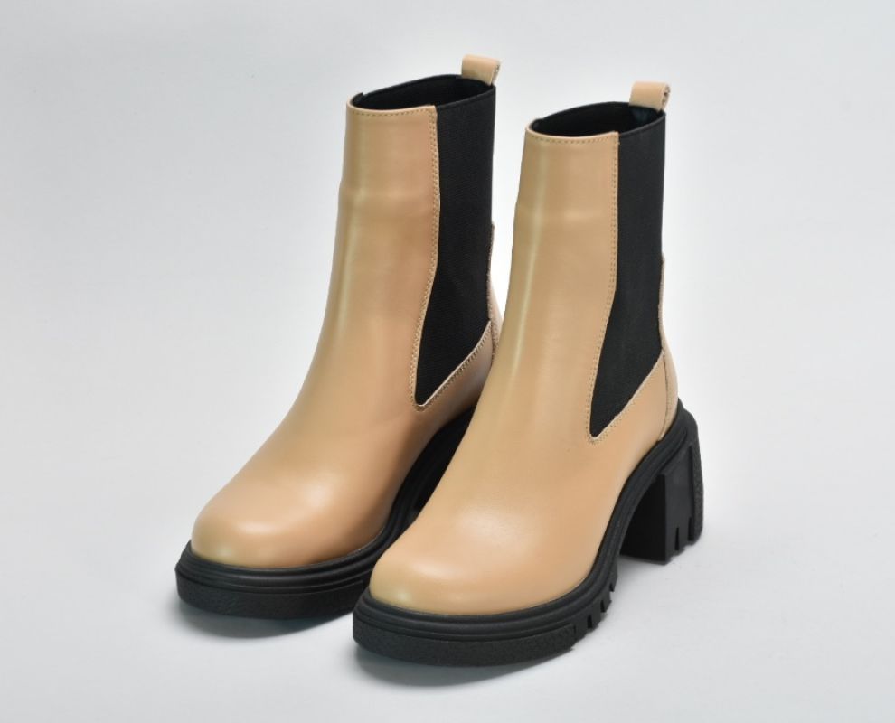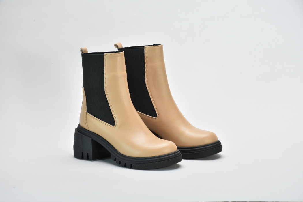 Черевики демісезонні челсі на підборах 6 см виготовлені з м'якої натуральної лицевої шкіри ніжного карамельного кольору , мають чорні еластичні вставки збоку для легкого надягання та знімання.