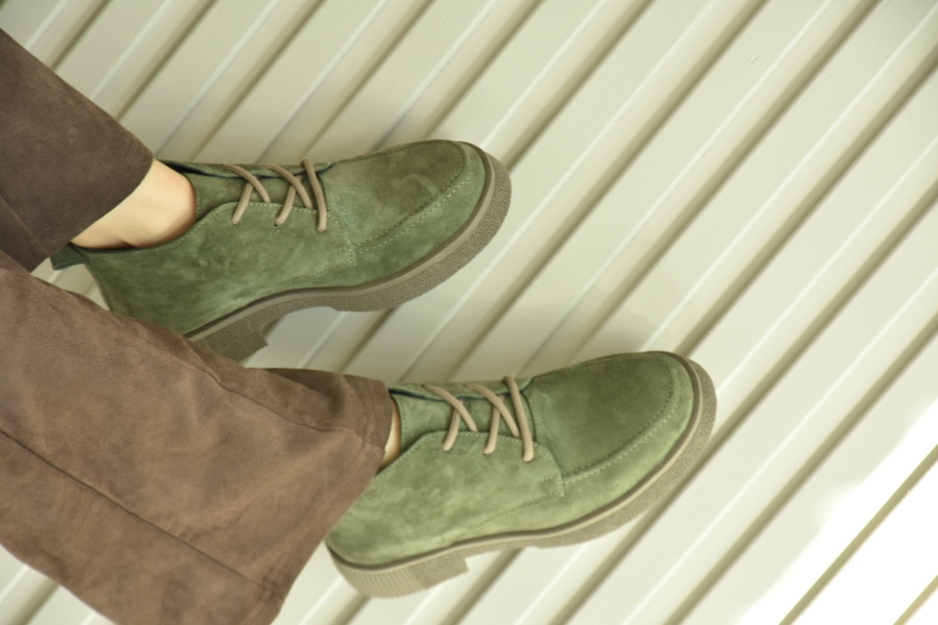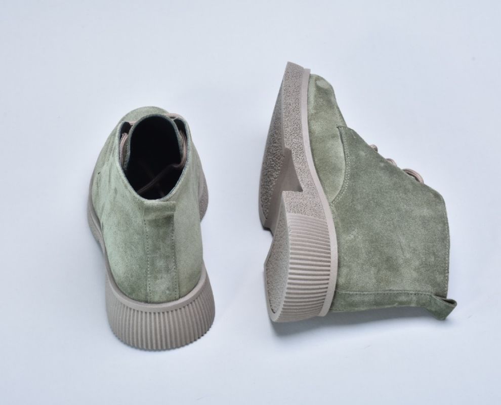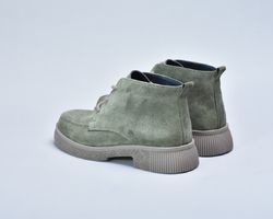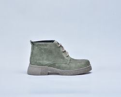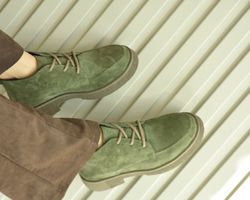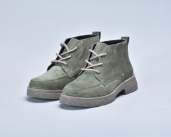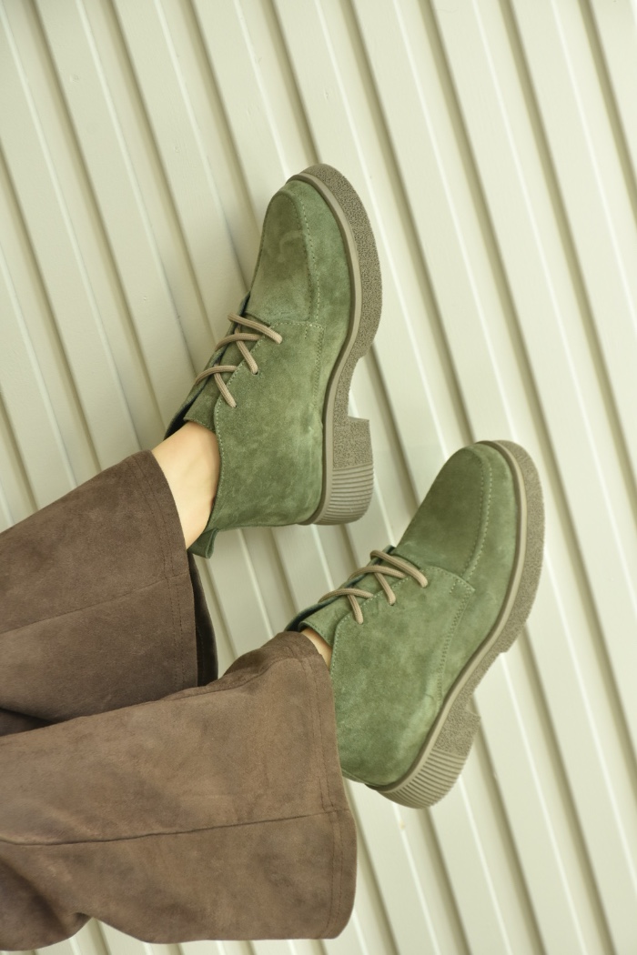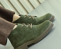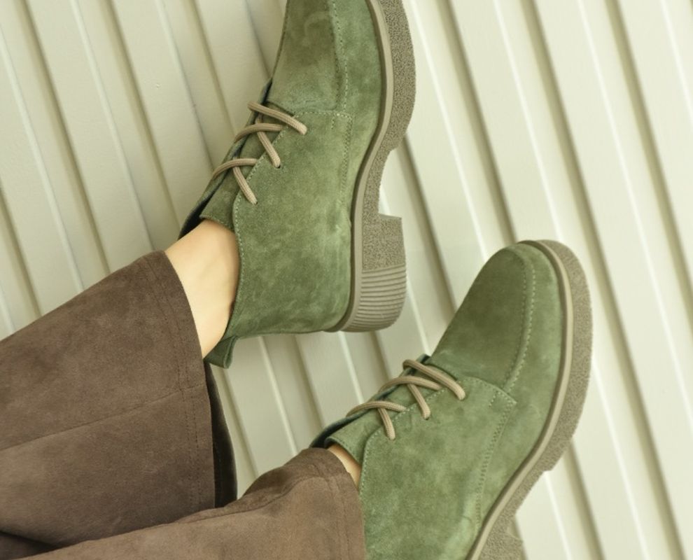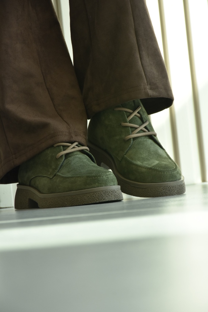 Ці стильні та комфортні черевики виготовлені з високоякісної натуральної замші насиченого оливкового відтінку. Це ідеальний варіант для тих, хто цінує поєднання сучасного дизайну та натуральних матеріалів.