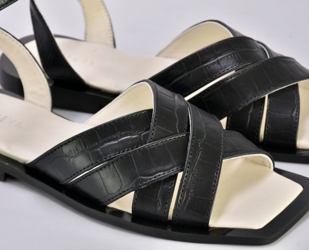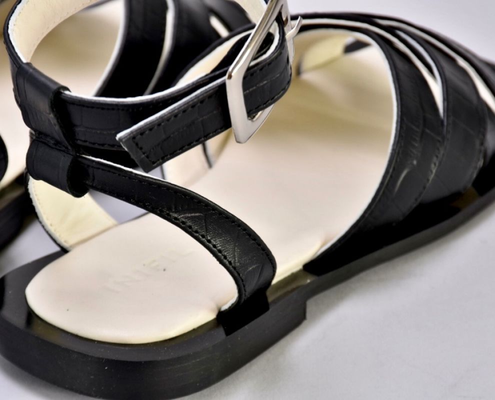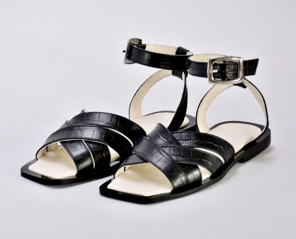 Босоніжки чорного кольору з шкіри з текстурою рептилїї надзвичайно зручні,Верх та всередині підклад взуття - натуральна шкіра вищого сорту.