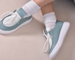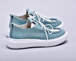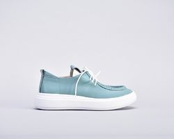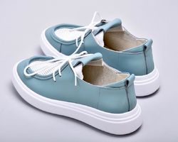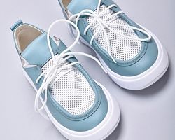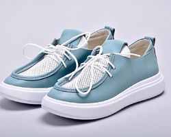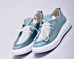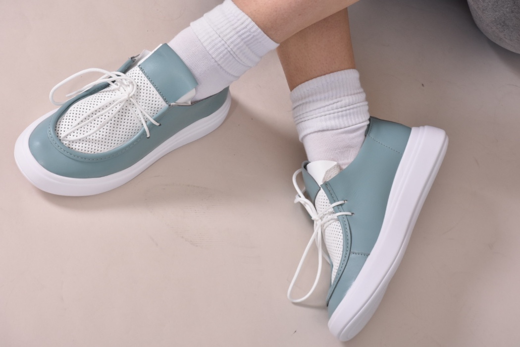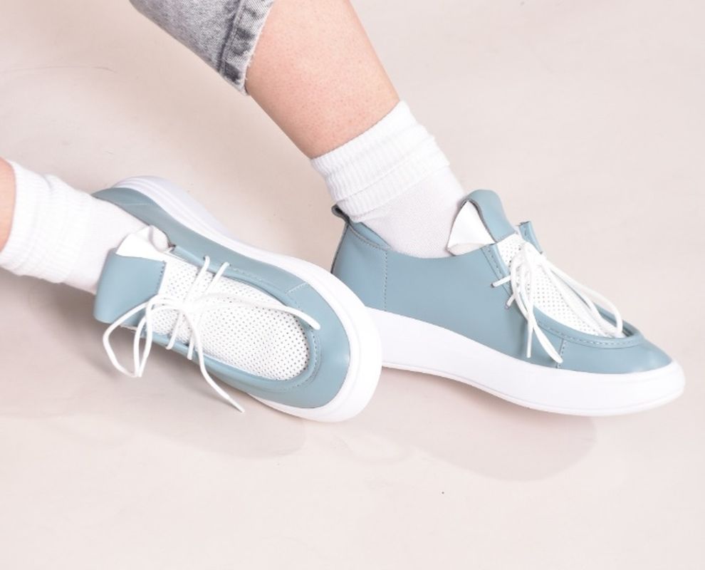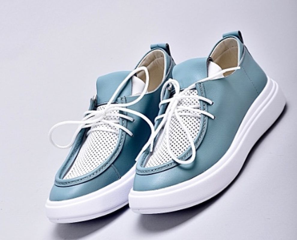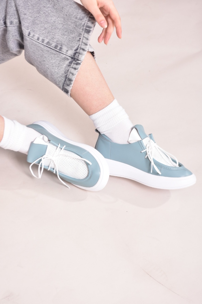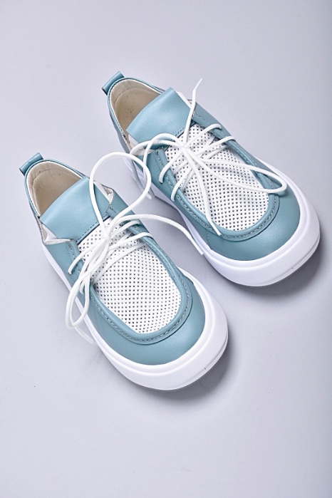 Дизайнерські шкіряні кеди бірюзово-білого кольору з перфарацією