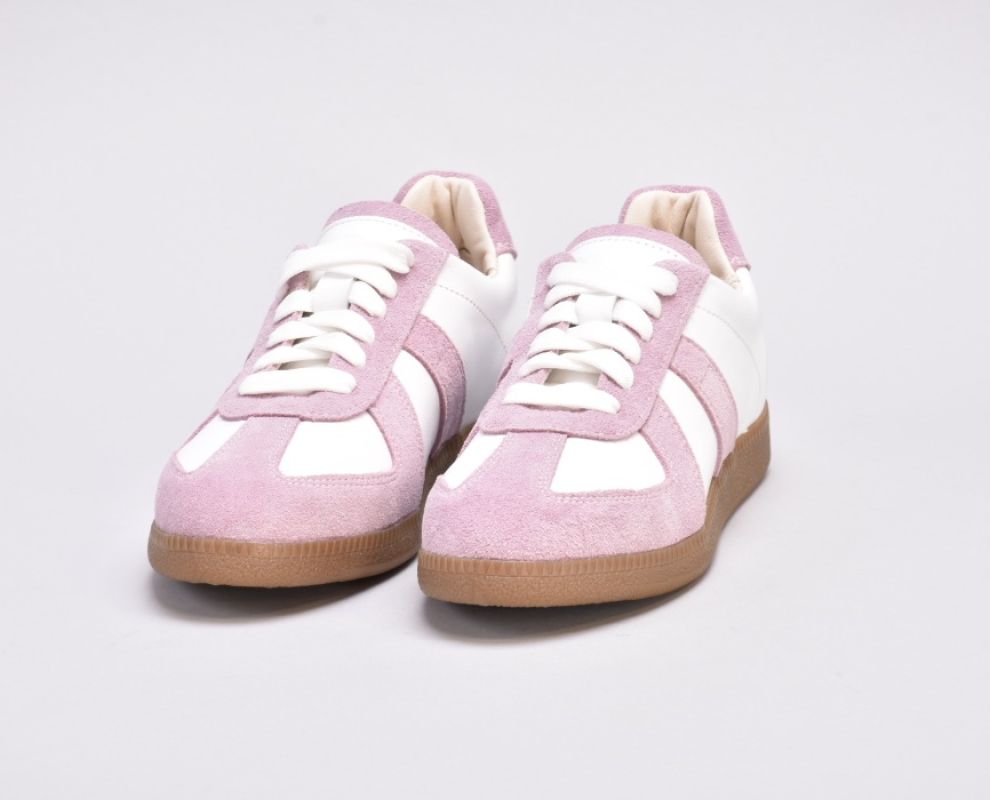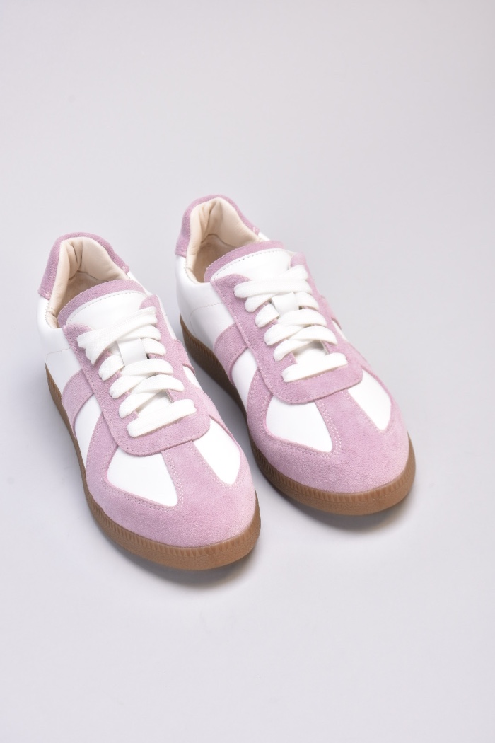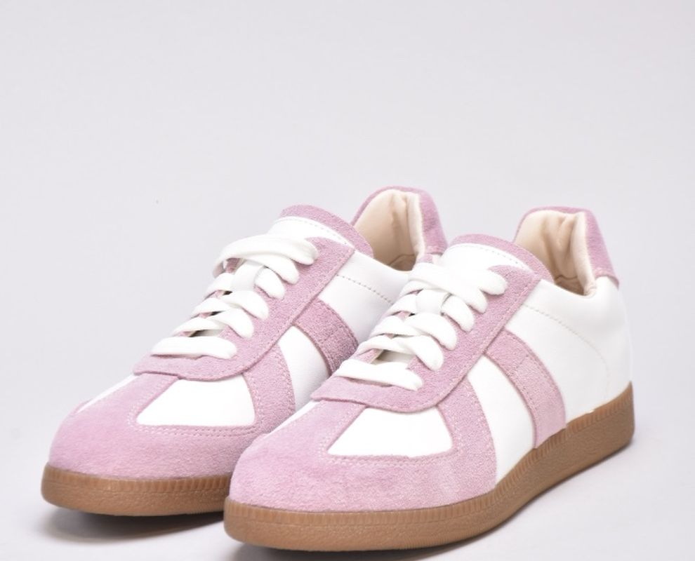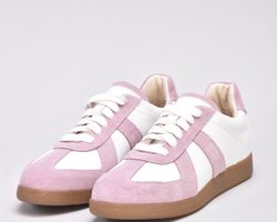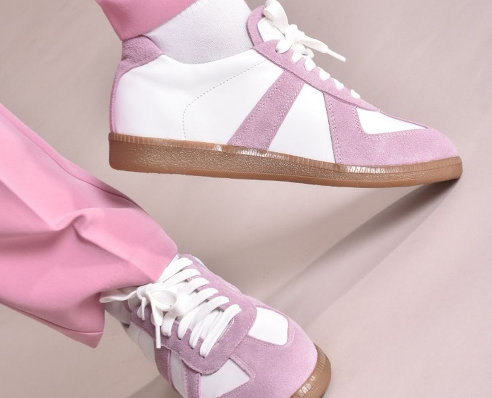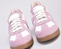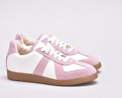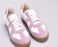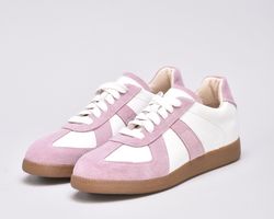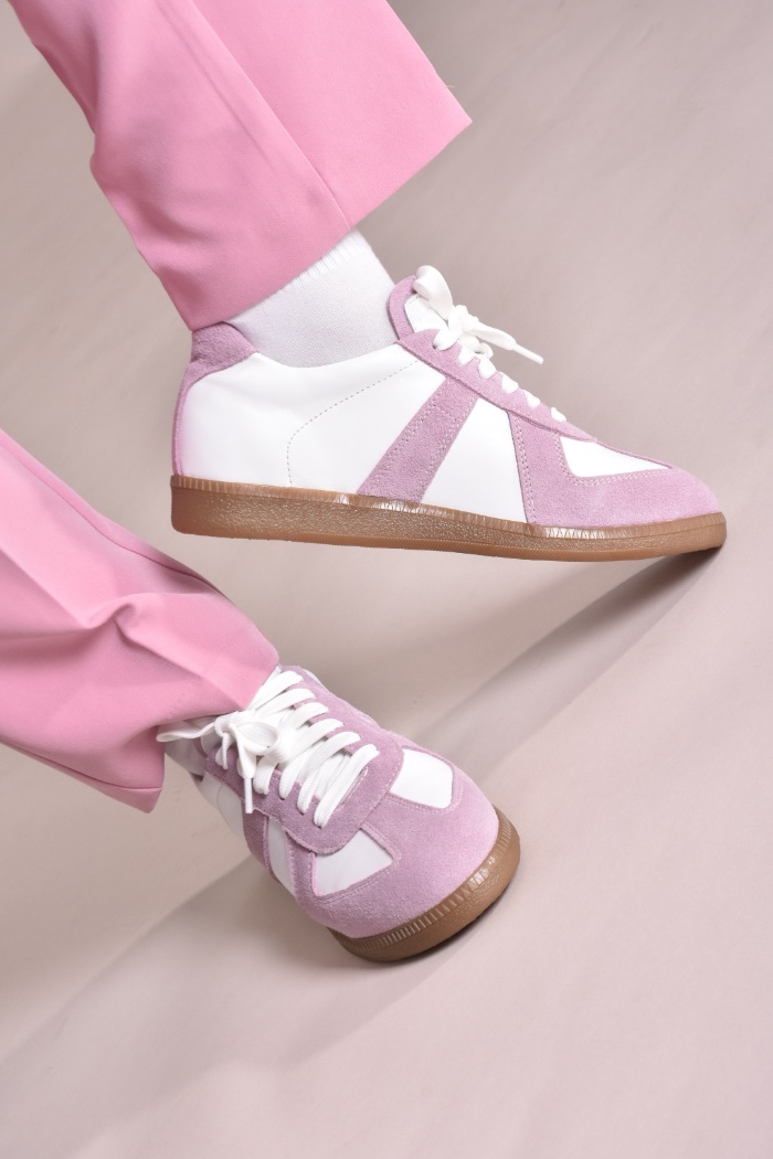 Кеди виконані в поєднанні білої шкіри та натуральної замші милого і романтичного бузково -рожевого кольору.
