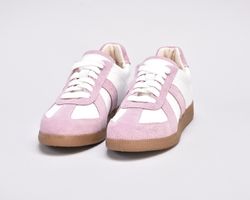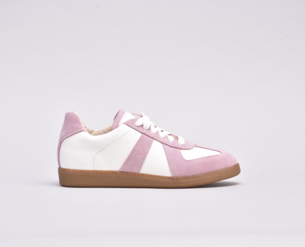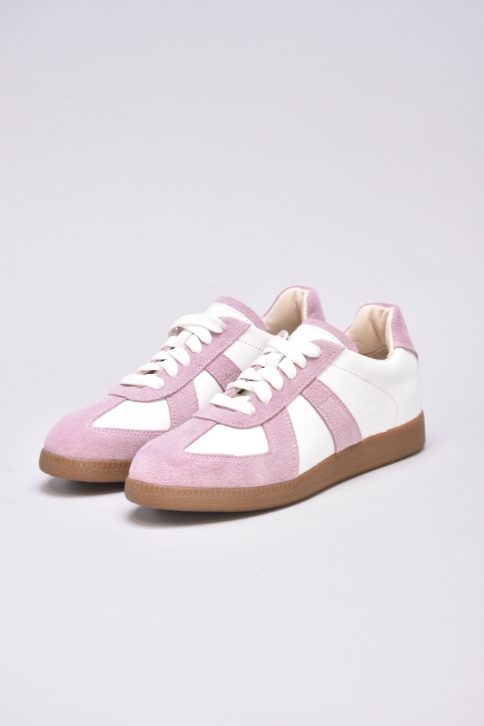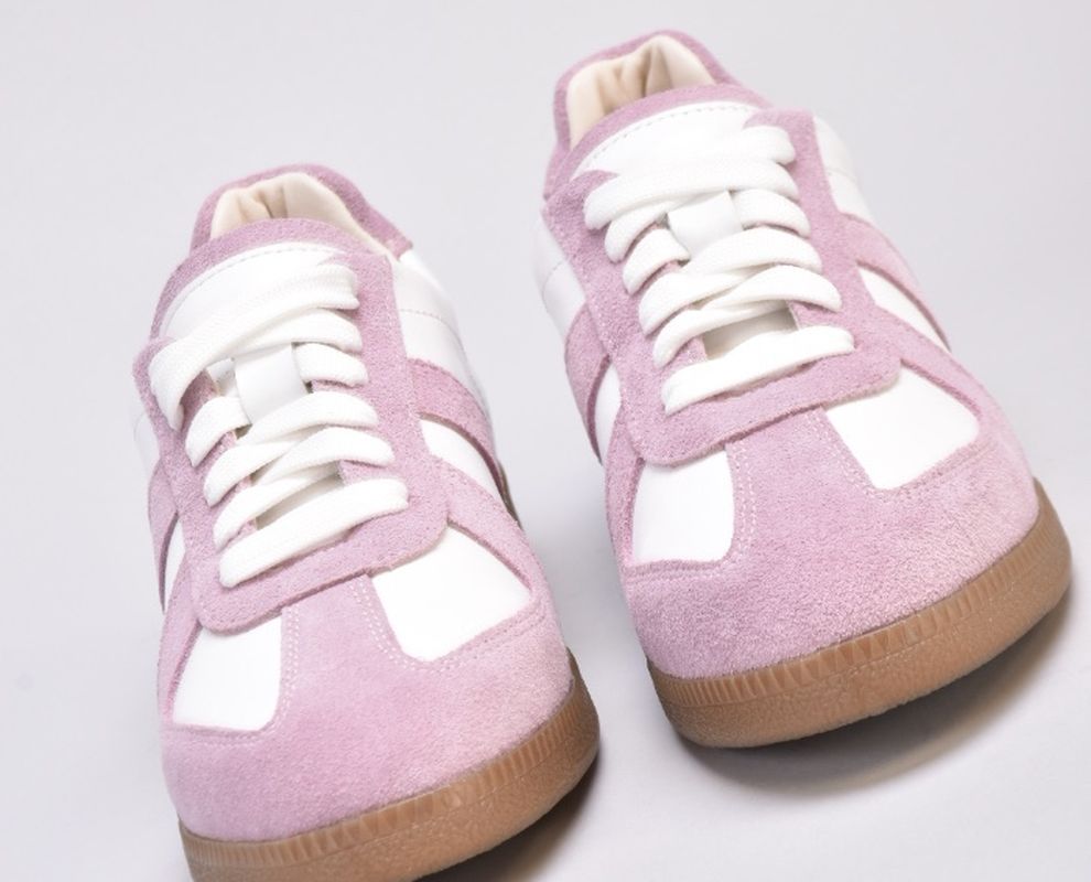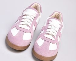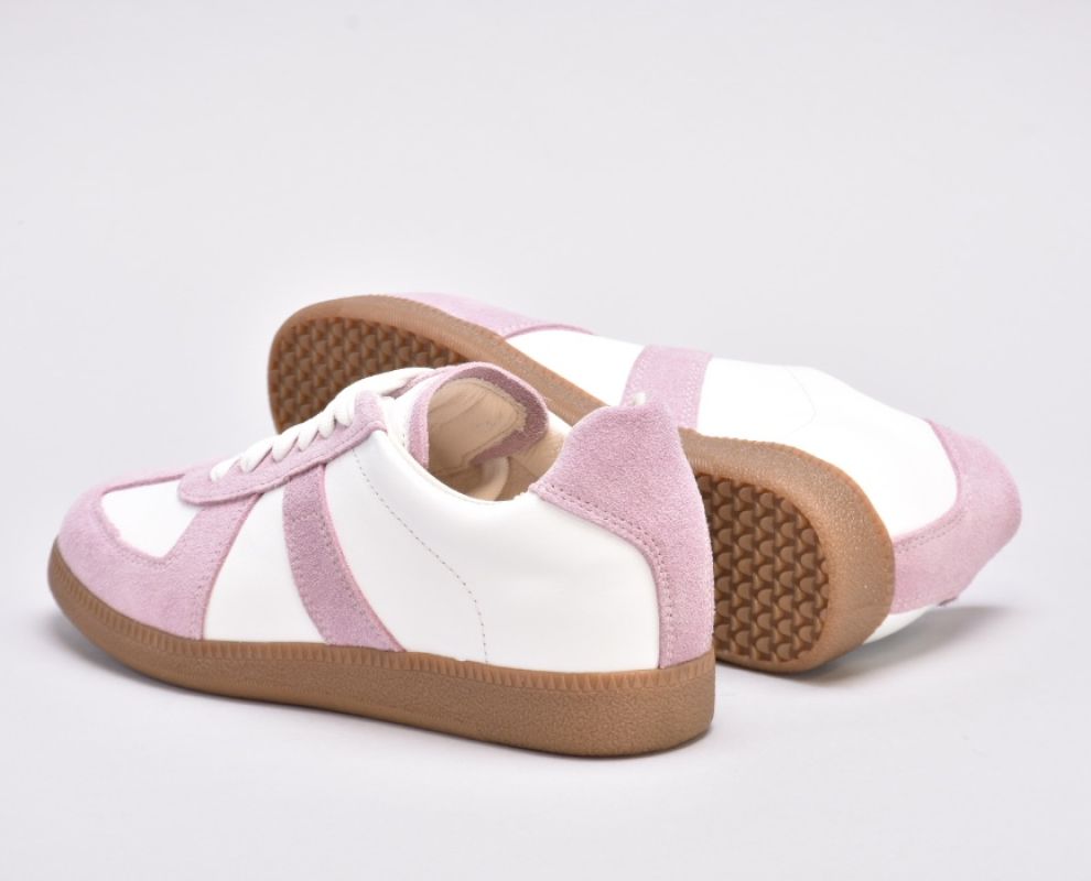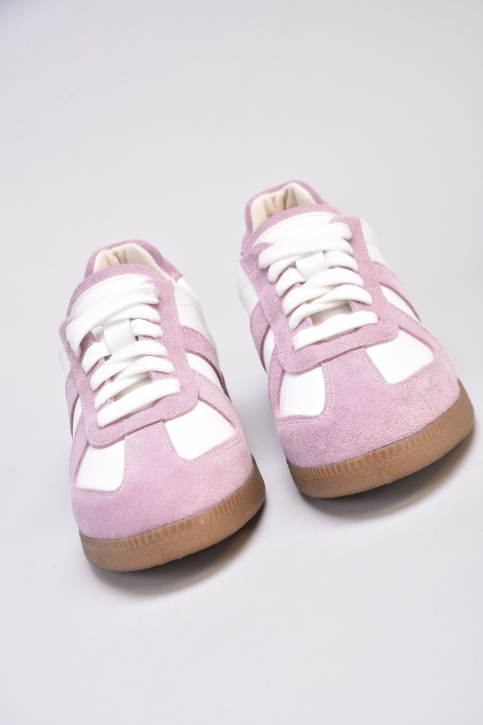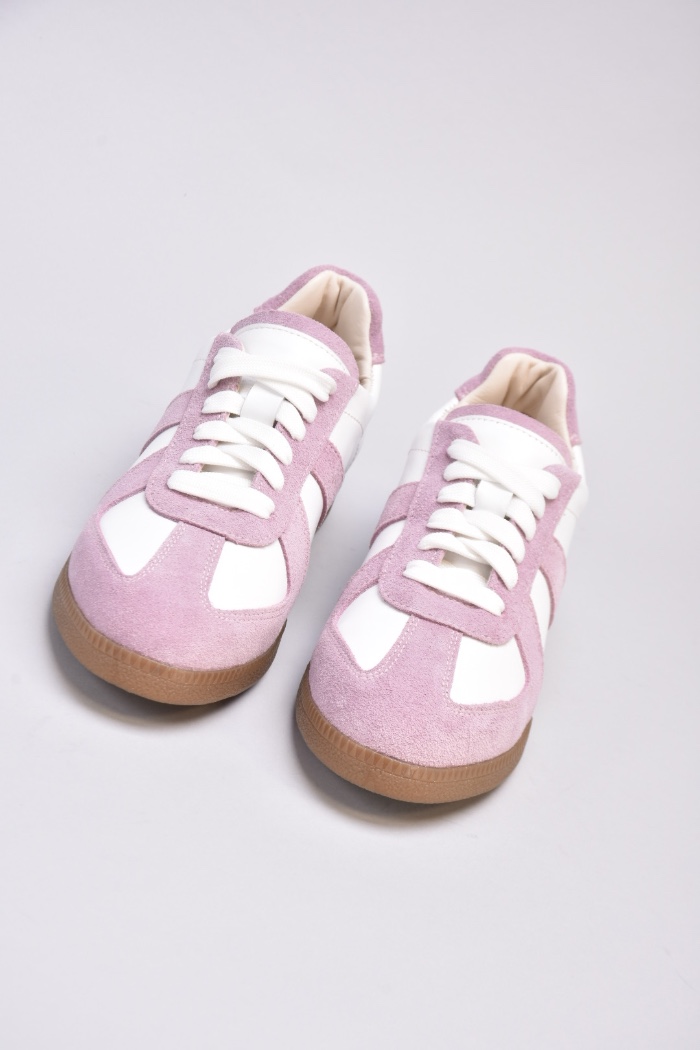 Кеди виконані в поєднанні білої шкіри та натуральної замші милого і романтичного бузково -рожевого кольору.