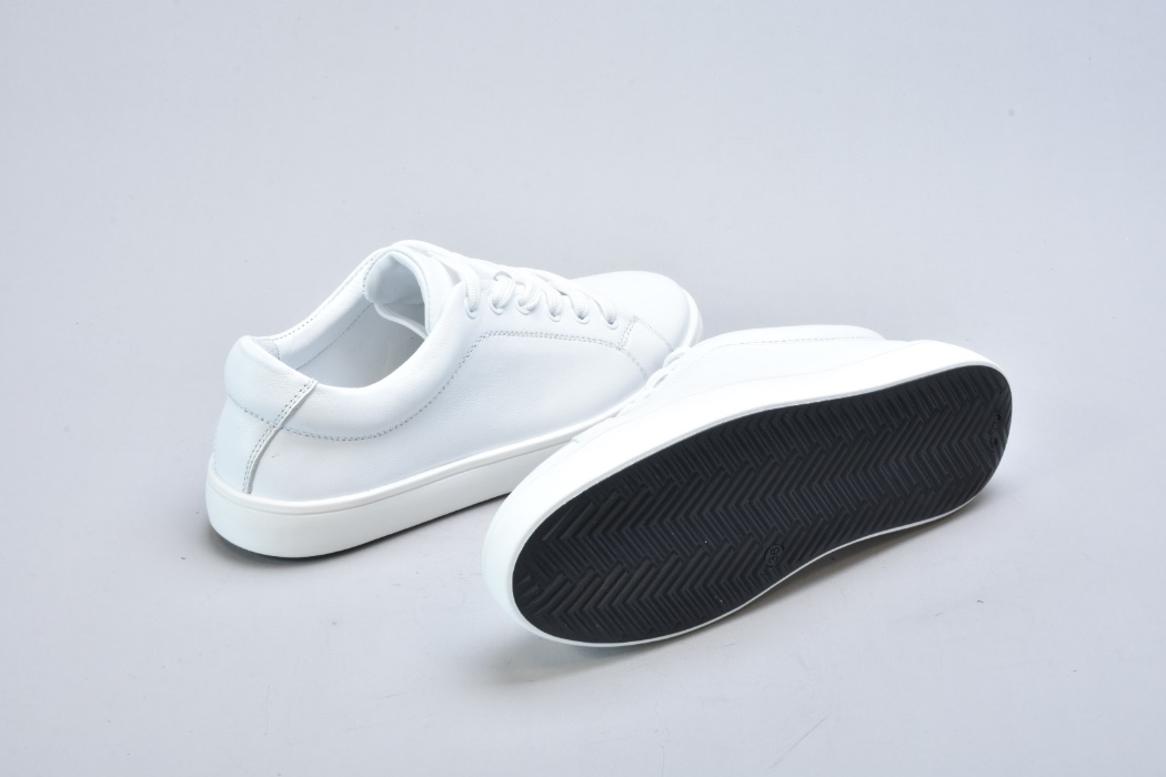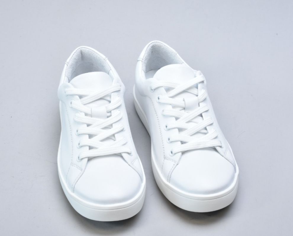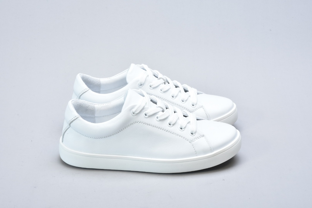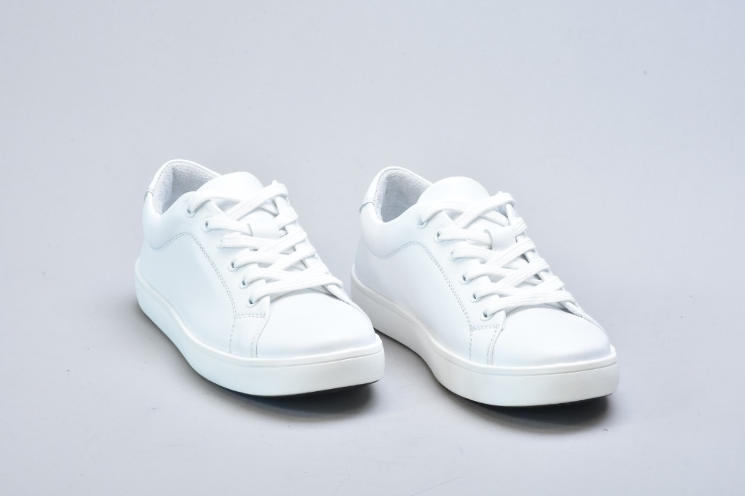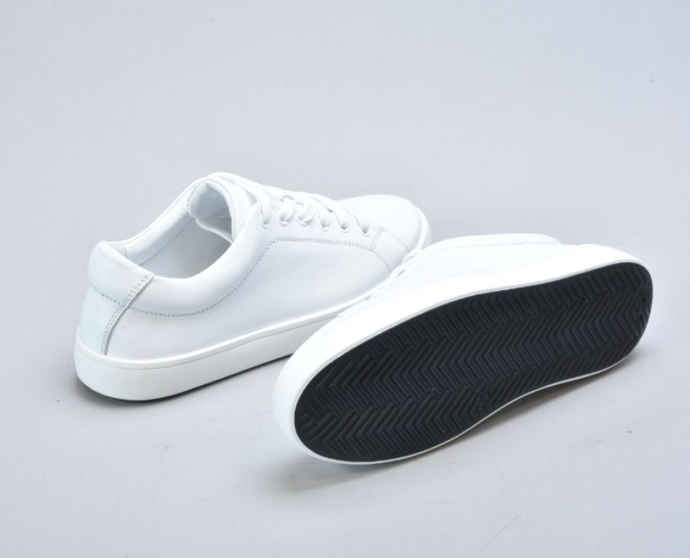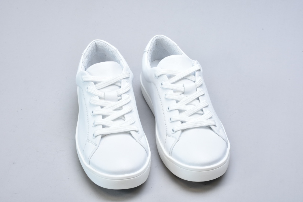 Кеди виконані з натуральної шкіри вищого сорту як зовні, так і всередині. Зовнішня шкіра гладка, рівномірна за фактурою, з м’яким благородним блиском, який підкреслює чистоту білого кольору. Внутрішня частина повністю оздоблена натуральною шкірою, що забезпечує комфортну посадку, приємні тактильні відчуття та оптимальний мікроклімат для стопи навіть при тривалому носінні.