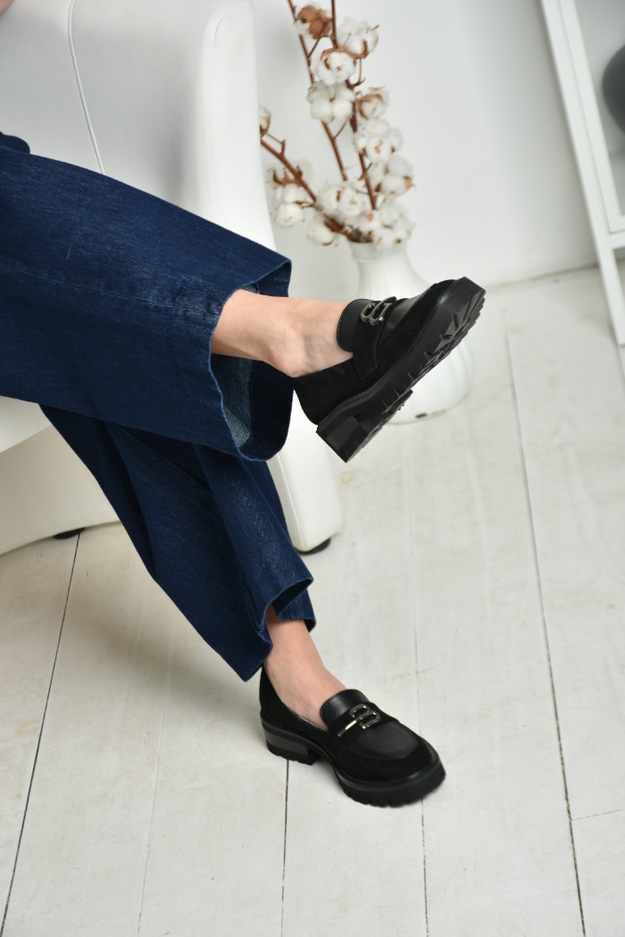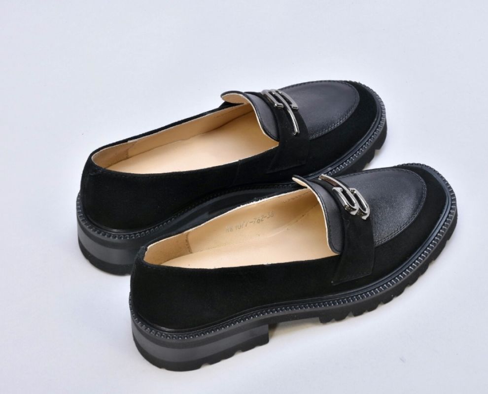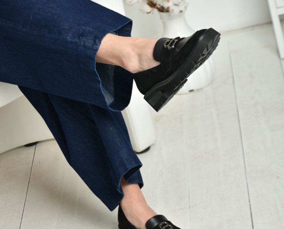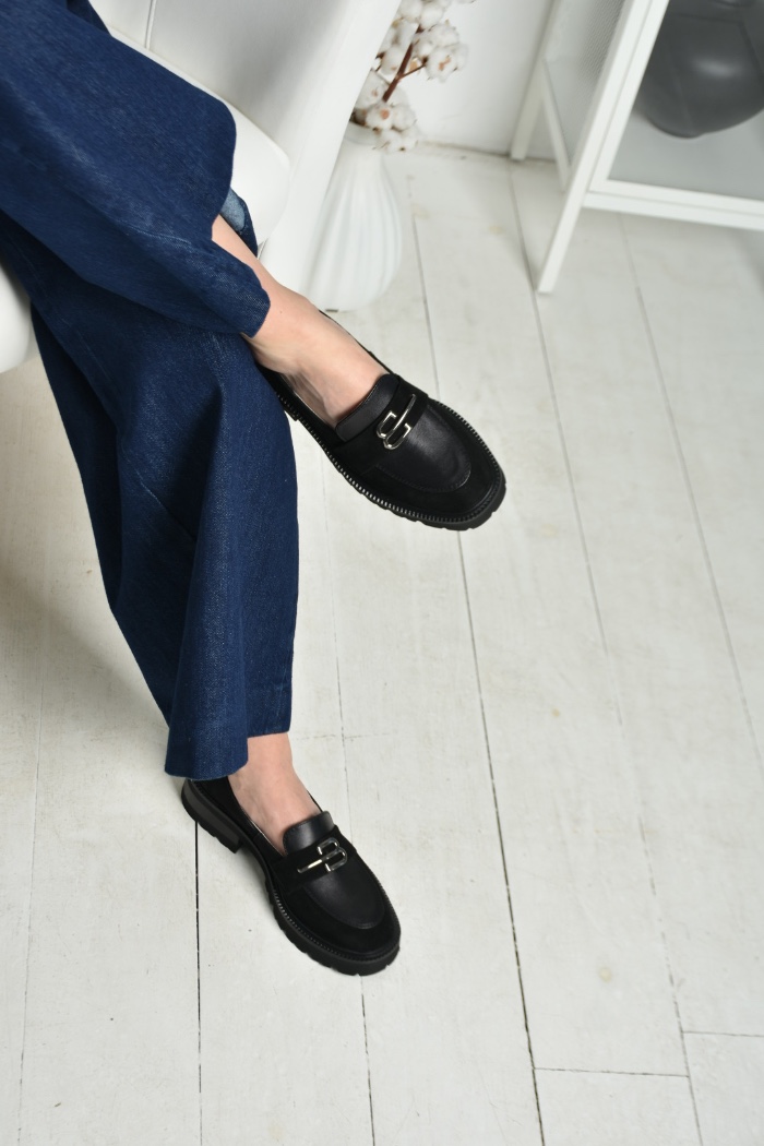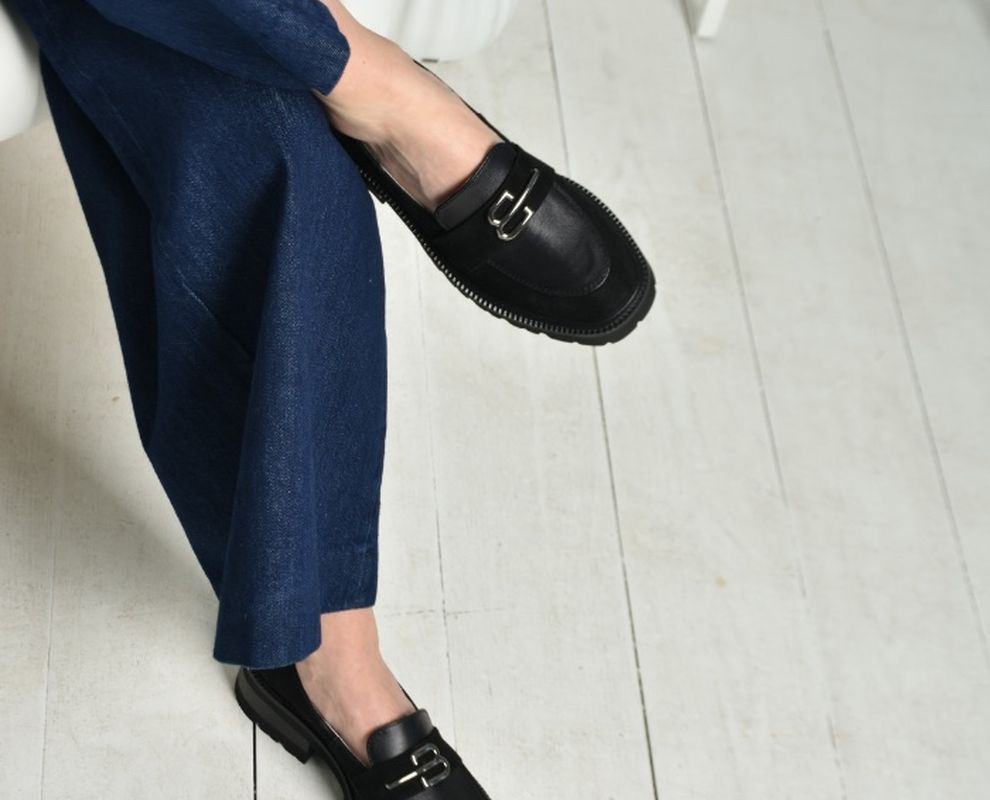 Чорні шкіряні лофери гучно заявляють про свою універсальність. Оздоблені натуральною замшею, вони стали кращим вибором для модниць.