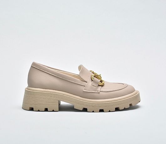Бежеві шкіряні лофери декоровані фурнітурою золотистого кольору