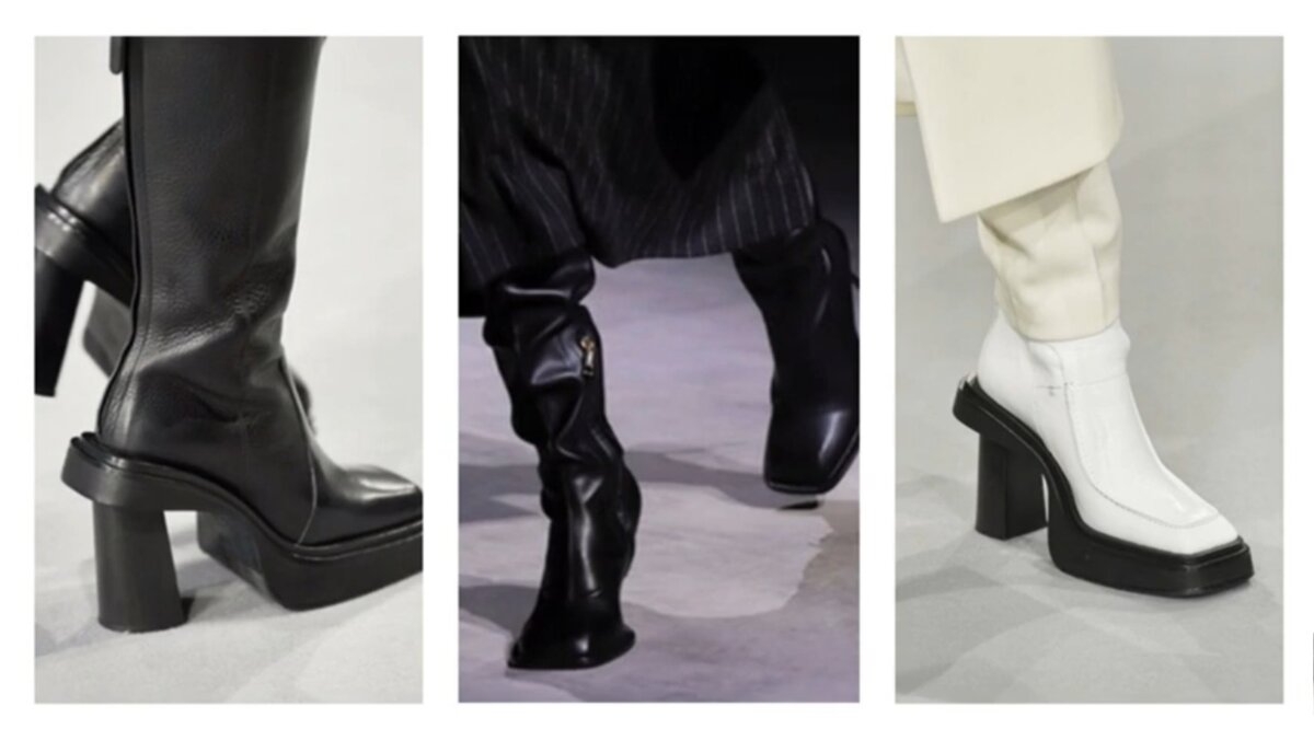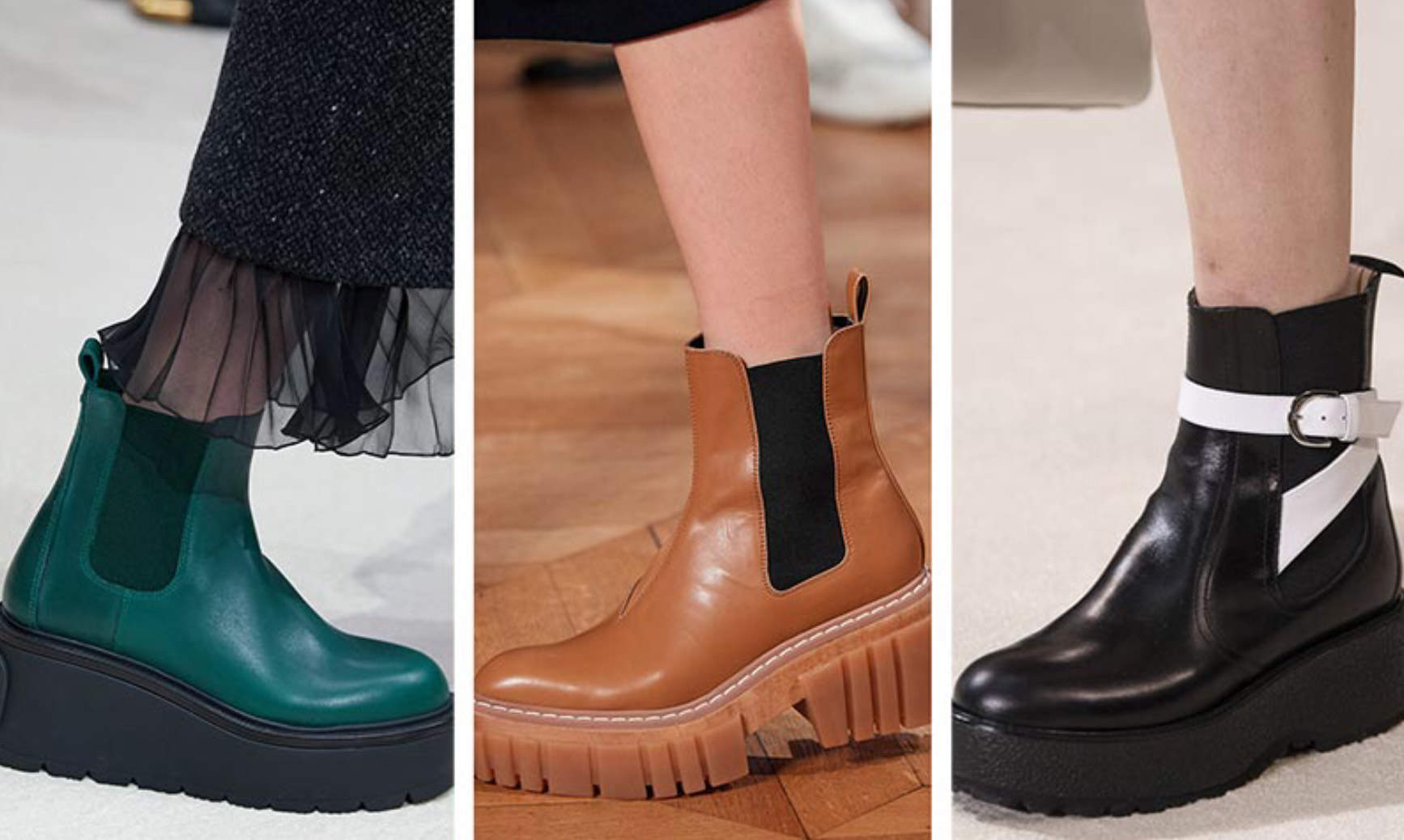 У тренді залишаються мілітарі черевики, челсі та чоботи до коліна з широкою халявою – все на платформі. Оновлюють тренд деталі, наприклад, прогумовані матеріали та тракторний протектор