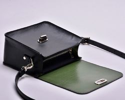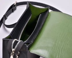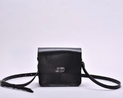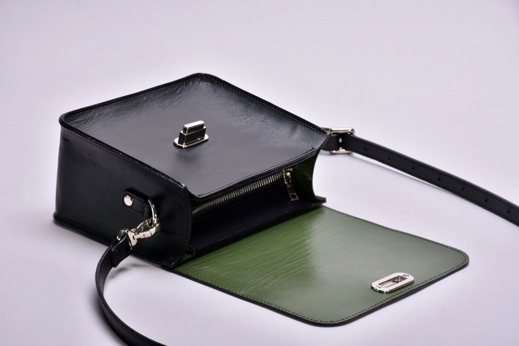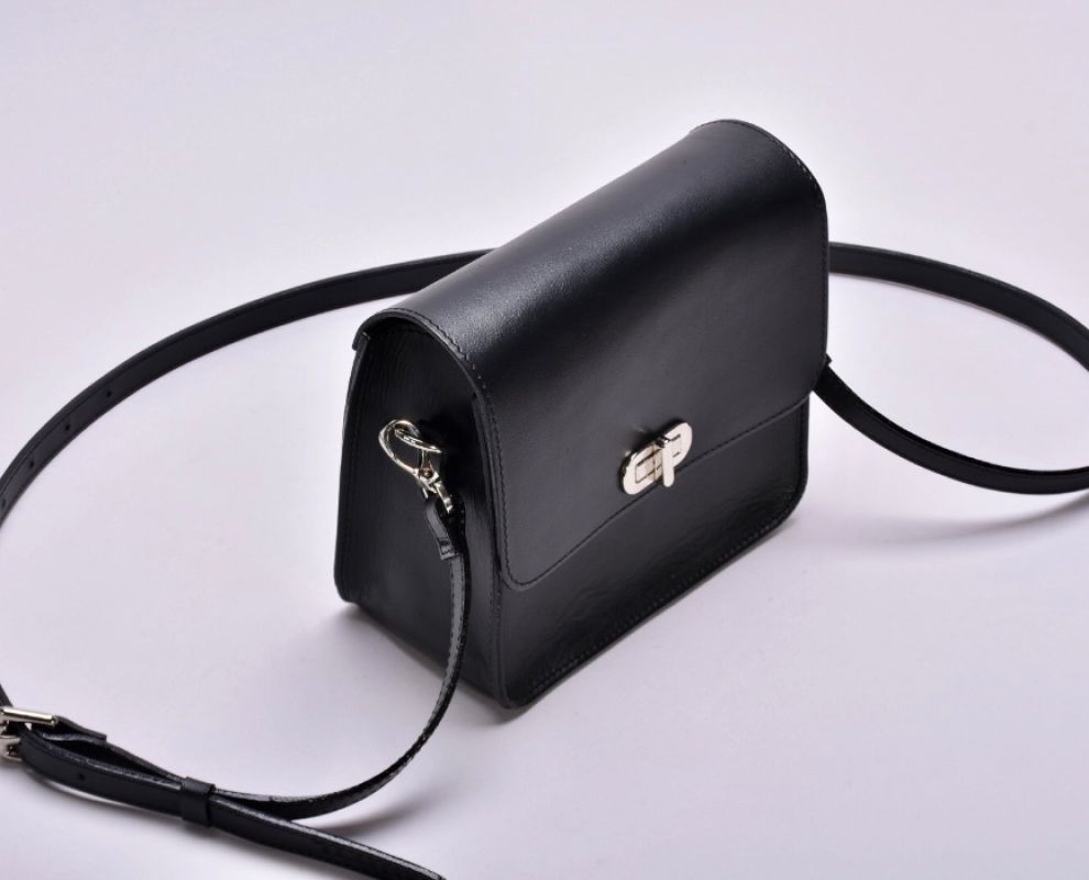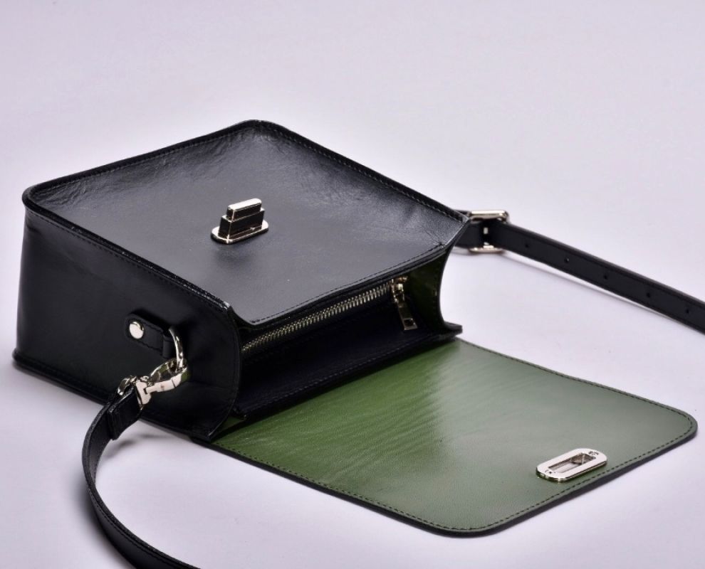 Сумка закривається на блискавку, що забезпечує повну безпеку вмісту, а зверху її доповнює клапан із металевою застібкою кольору нікель (срібло) — лаконічний акцент, який виглядає вишукано на тлі глибокого чорного кольору.