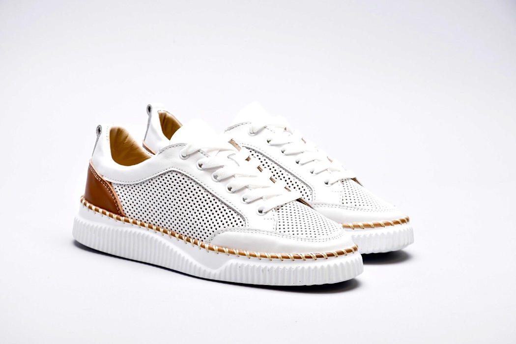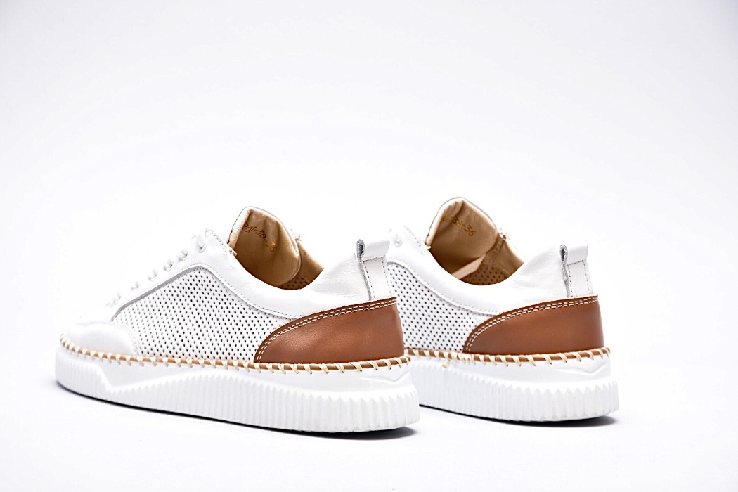 Кеди з перфорацією виконані з натуральної шкіри ,підклад натуральна шкіра .Оснащені коричневою шкірою та мають підошву декоровану коричневим кантом.