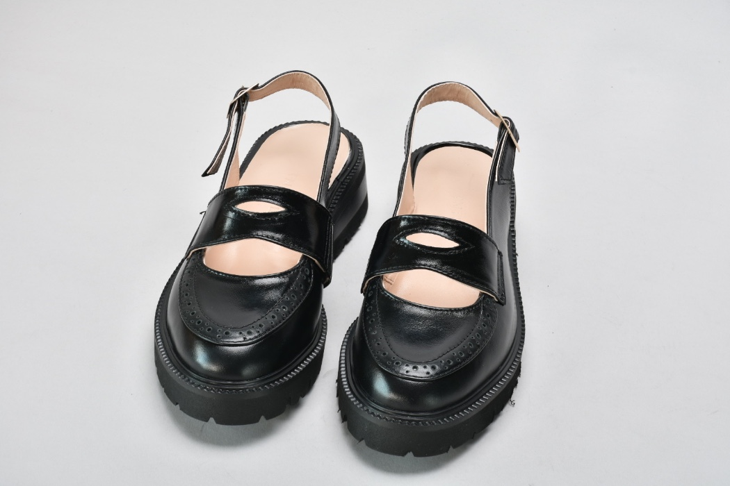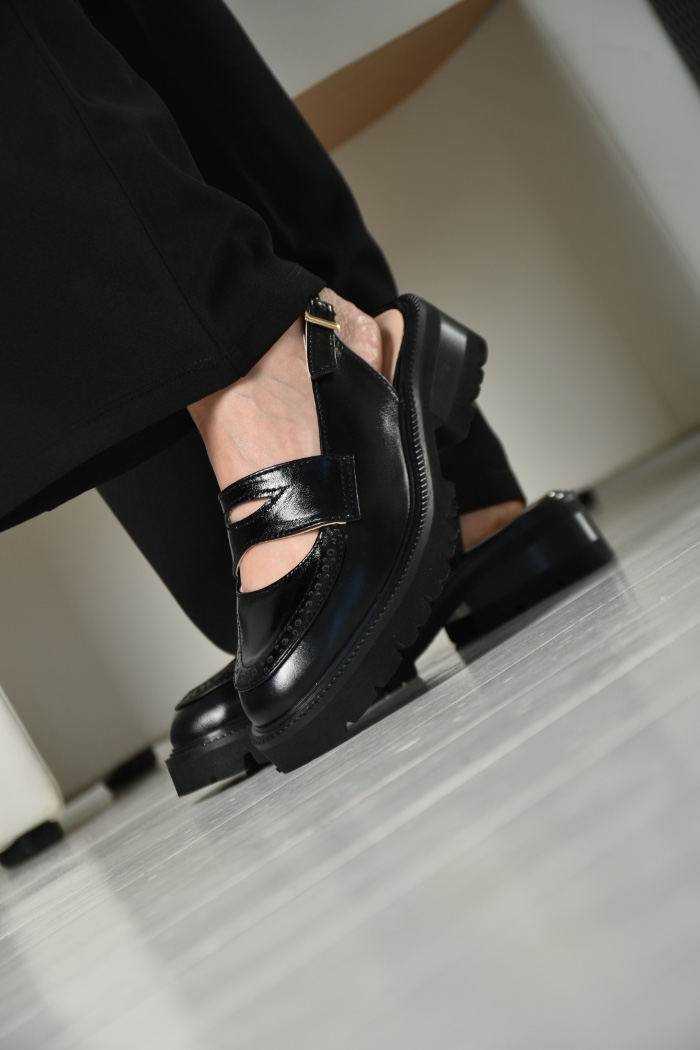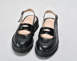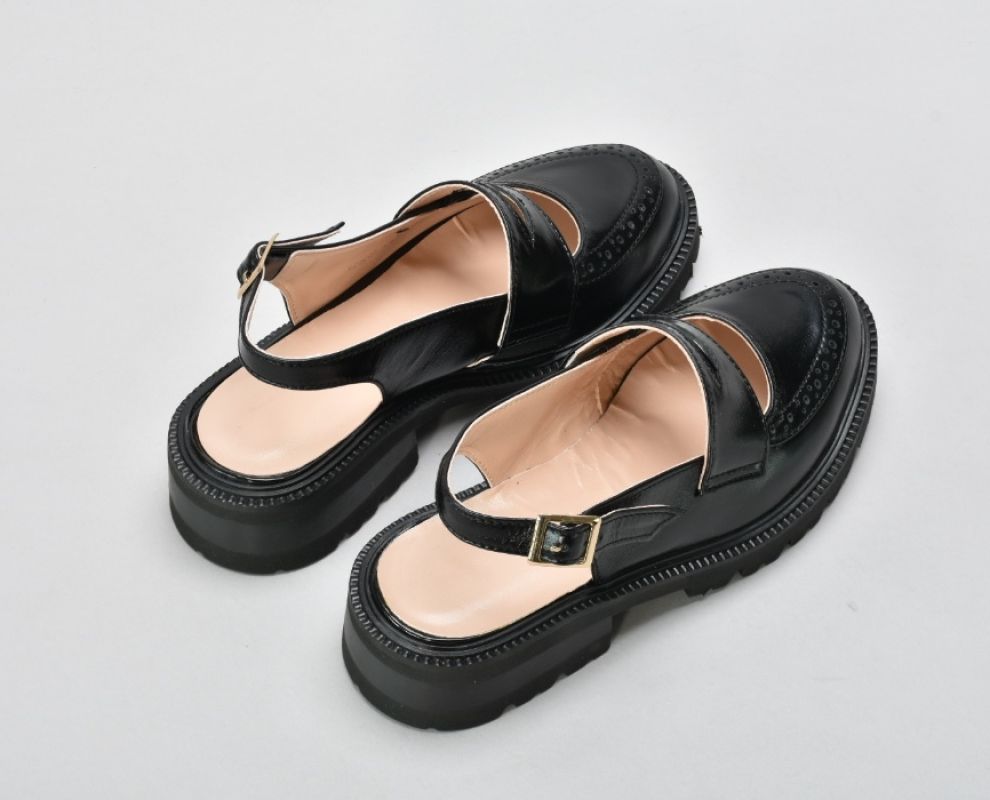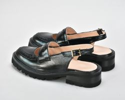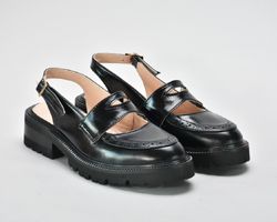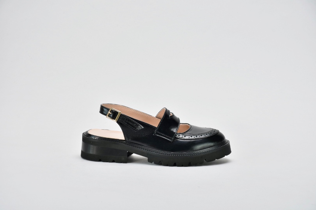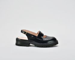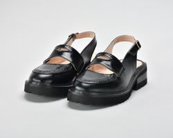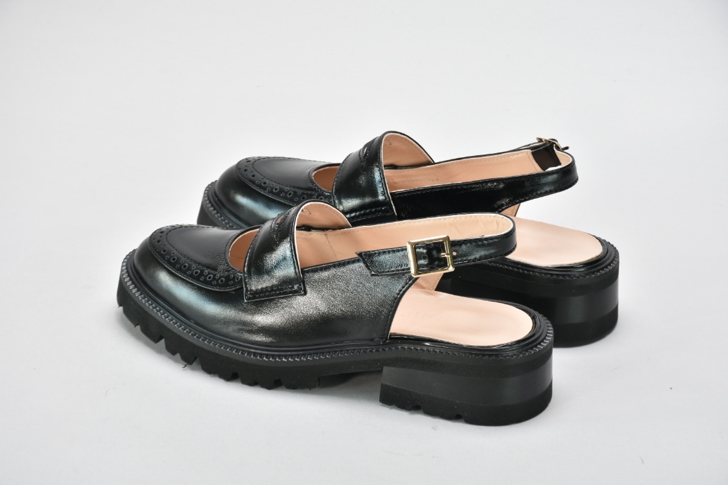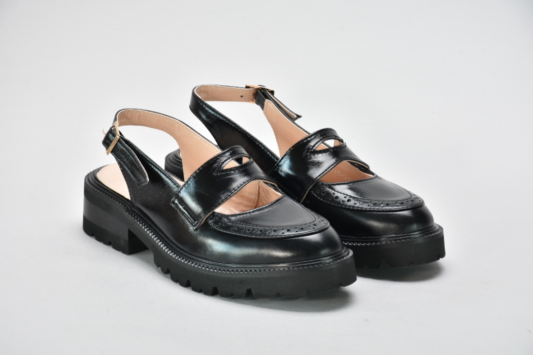 Слінгбеки виготовлені з чорної натуральної шкіри наплак вищого сорту , мають полегшену підошву ,ремінець з застібкою , що регулюється забезпечить ідеальну посадку.