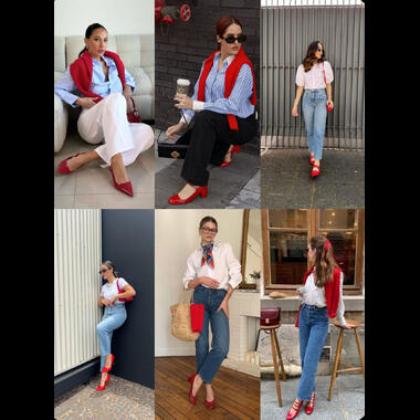 Поєднання чорних або темно-синіх брюк, білої сорочки та червоних балеток — безпрограшний варіант. Таке взуття стає головним акцентом образу та додає йому характеру. Для кращого результату варто обирати лаконічний крій брюк без зайвих деталей.