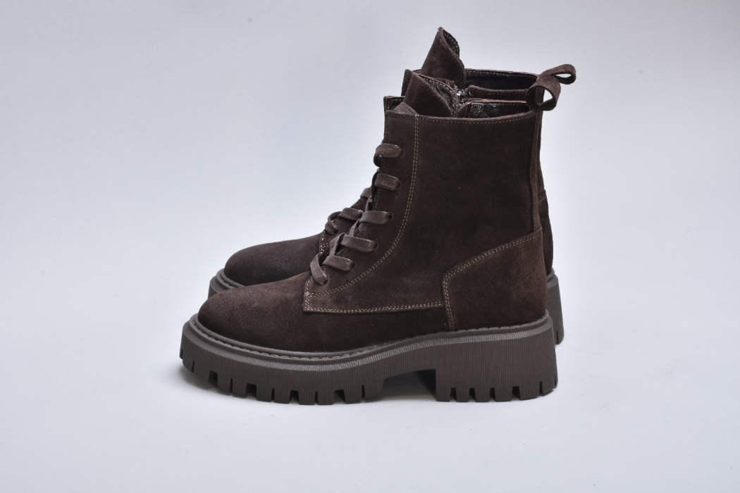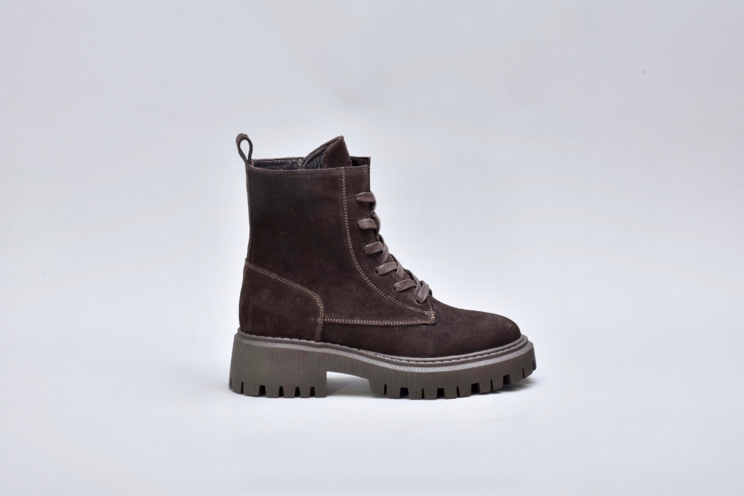 Шнурівка виконана у тон замші, створюючи гармонійний total look. Вона не лише декоративна, а й функціональна — дозволяє точно регулювати посадку по нозі. Поруч розміщена металева блискавка, що додає зручності та динамічного акценту.