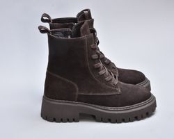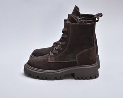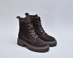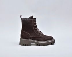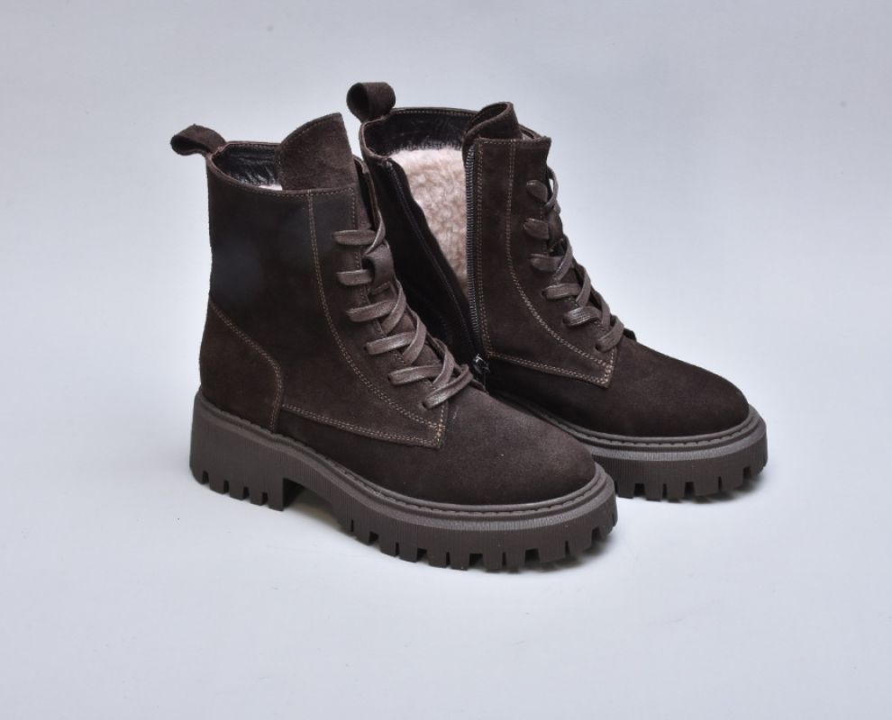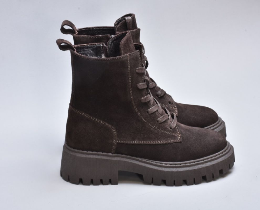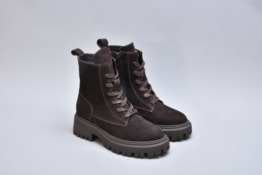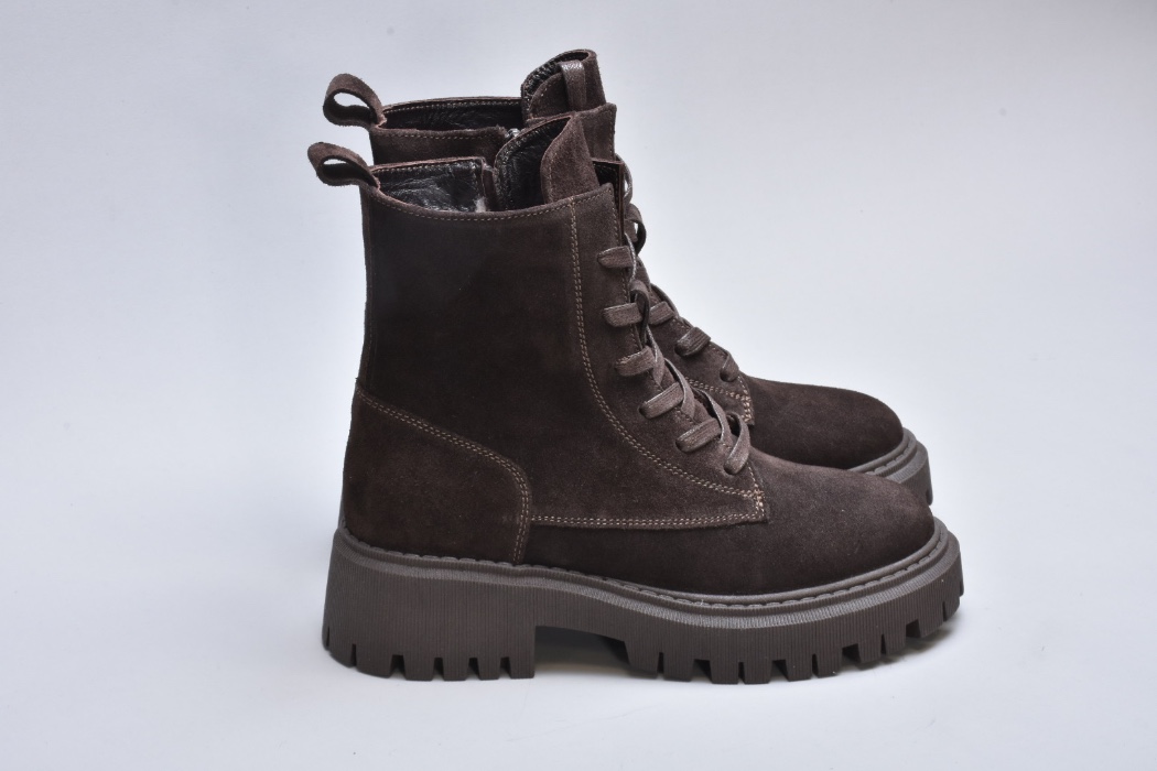 Підошва — масивна, проте візуально збалансована. Виготовлена з високоякісного термостійкого поліуретану з глибоким рифленням, вона забезпечує впевнене зчеплення з поверхнею навіть узимку. Її геометричний дизайн додає черевикам трендової брутальності, що ідеально поєднується з м’якою замшею.