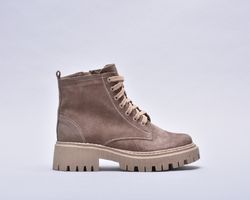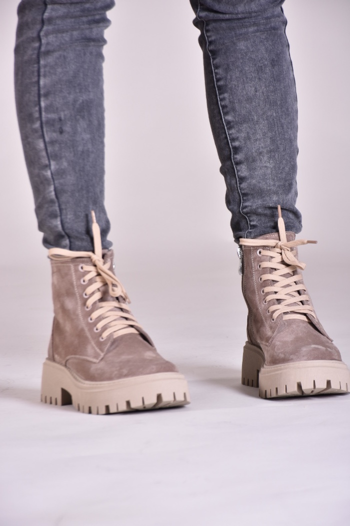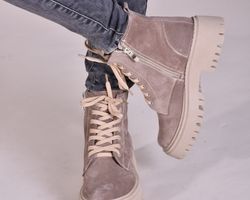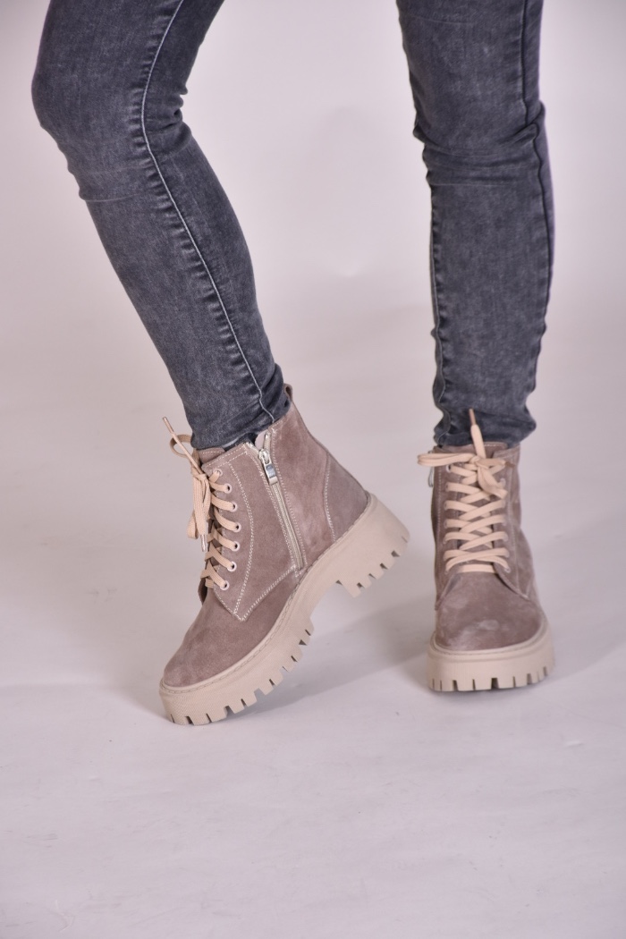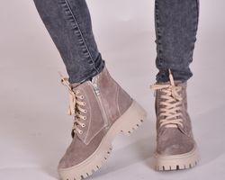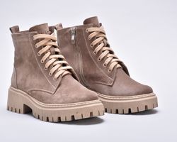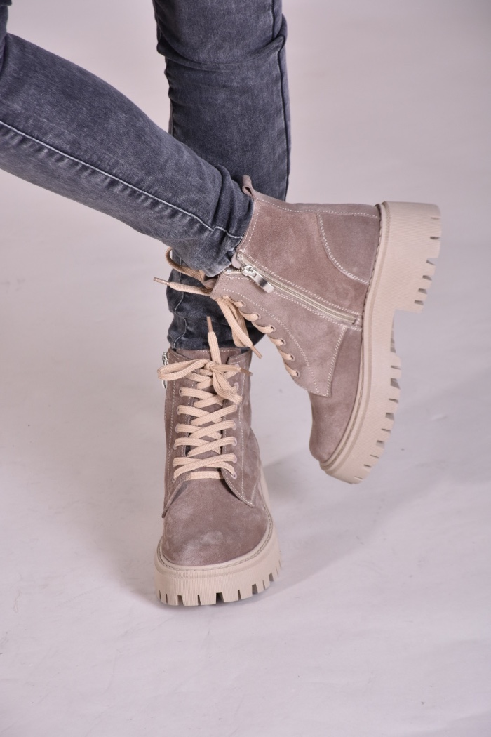 Зимові темно бежеві черевики з натуральної замші.Черевики зверху оснащені шнурівкою для фіксації підйому,збоку мають блискавку.