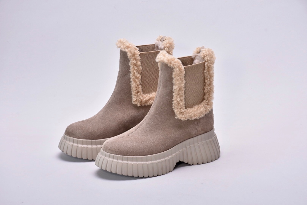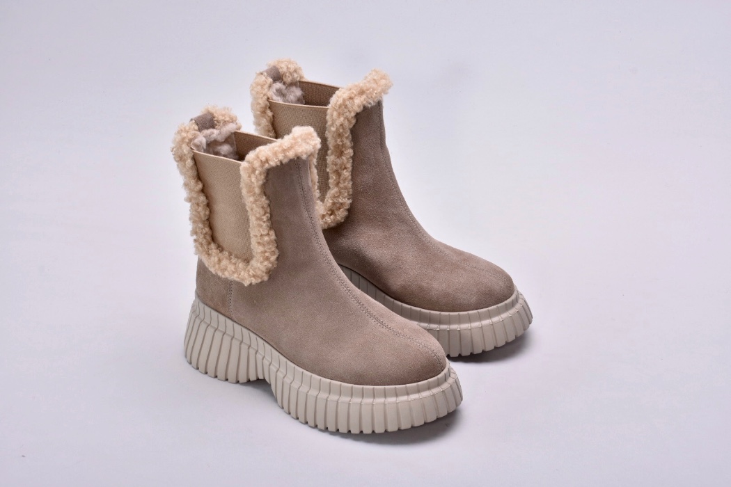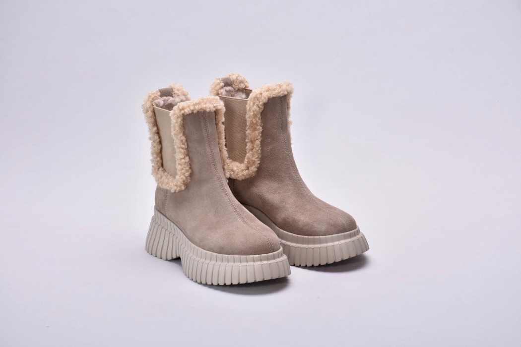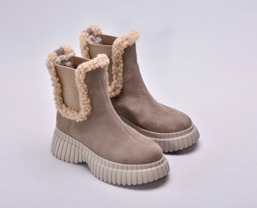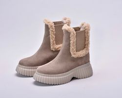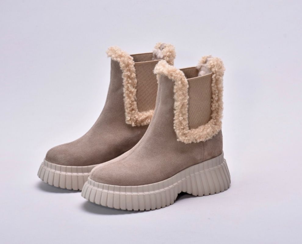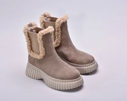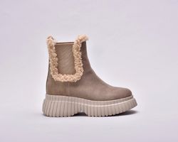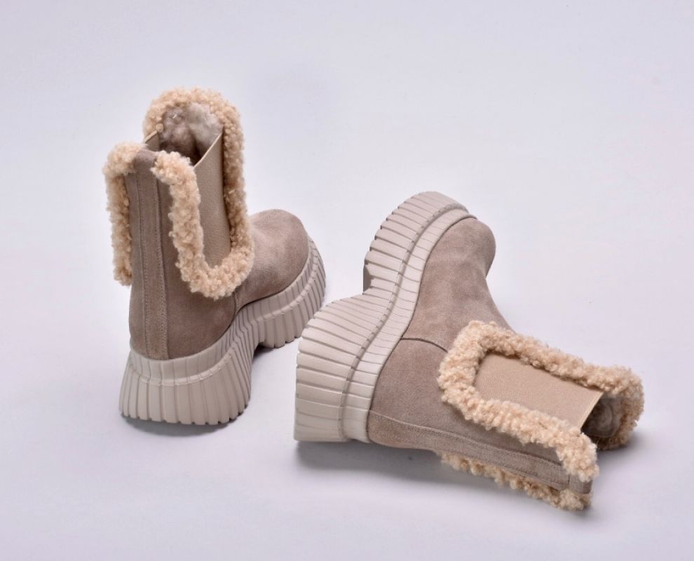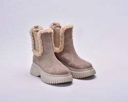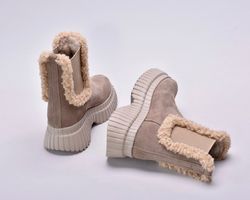 Виготовлені з натуральної замші бежевого кольору ,утеплені вовною ,мають платформу та еластичні вставки на бокових частинах виробу декоровані штучним хутром бежевого кольору.