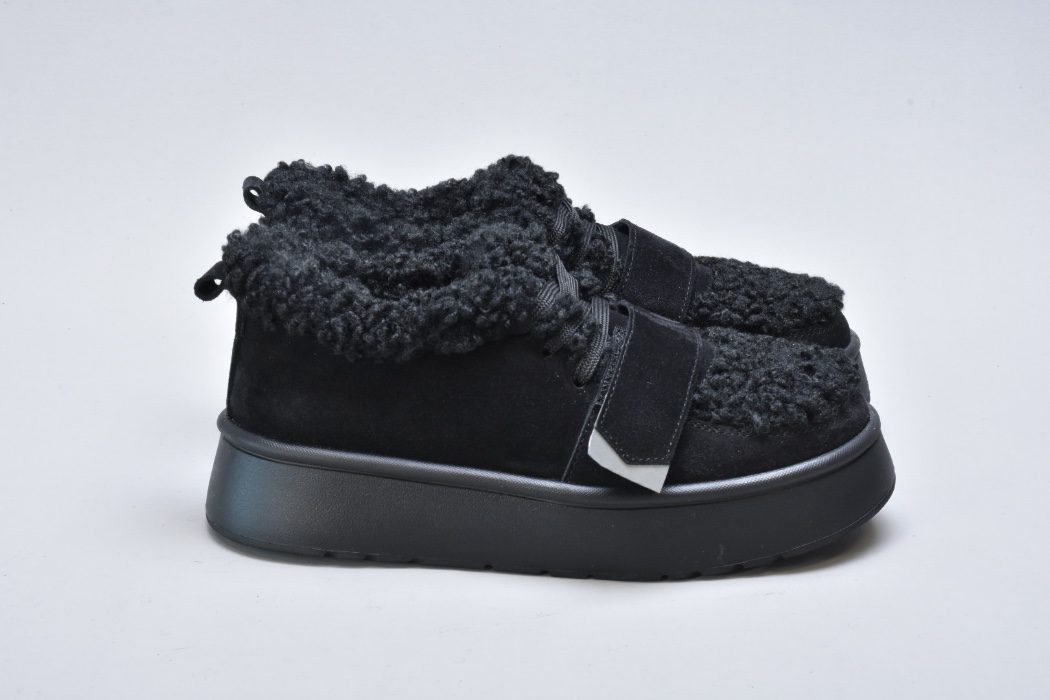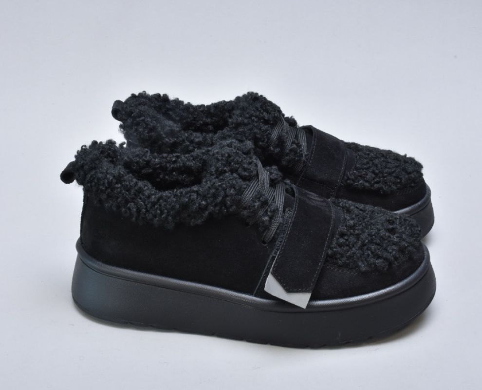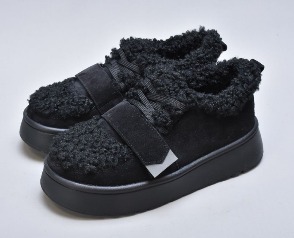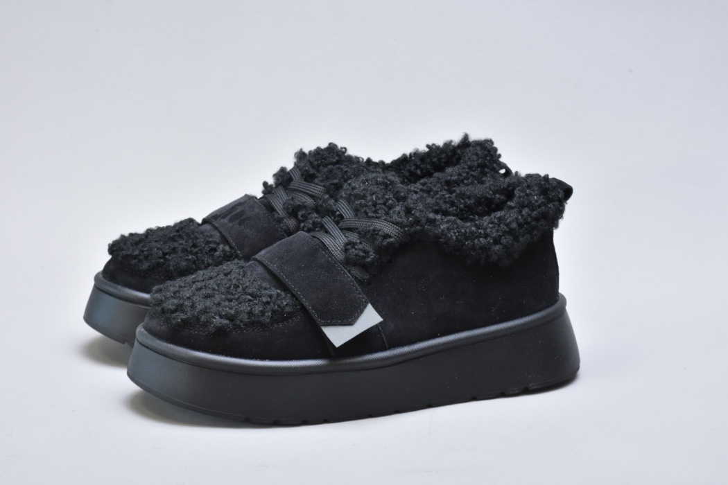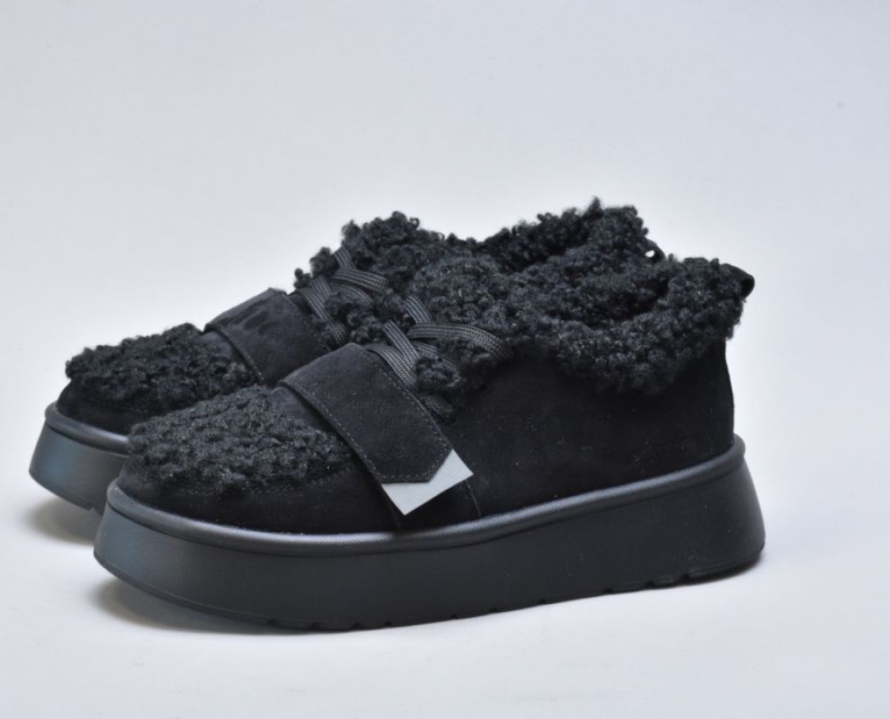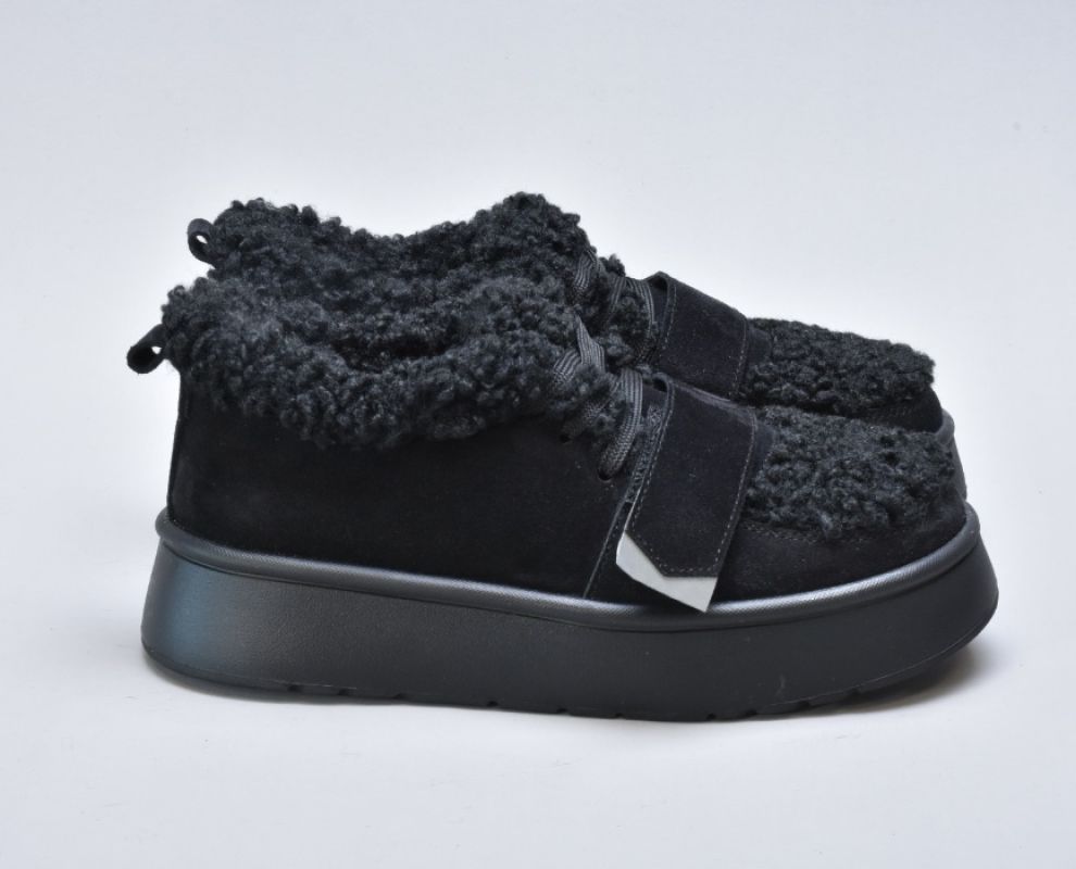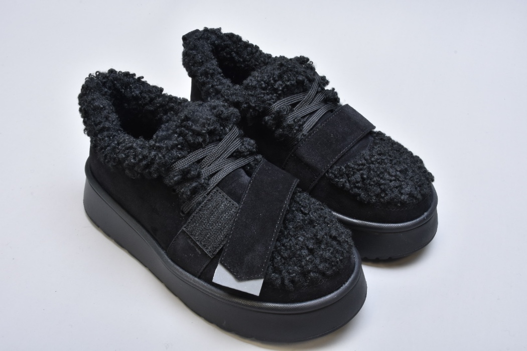 Оздоблення виконано з фактурного штучного хутра нового покоління, яке зовні нагадує натуральну овчину. Воно не лише додає моделі об’єму й візуальної м’якості, а й створює відчуття тепла та затишку. Завдяки високій щільності волокна хутро довго зберігає свій вигляд, не злежується та не втрачає форму. Така фактура надає черевикам дизайнерського характеру й робить їх справжнім акцентом зимового образу.