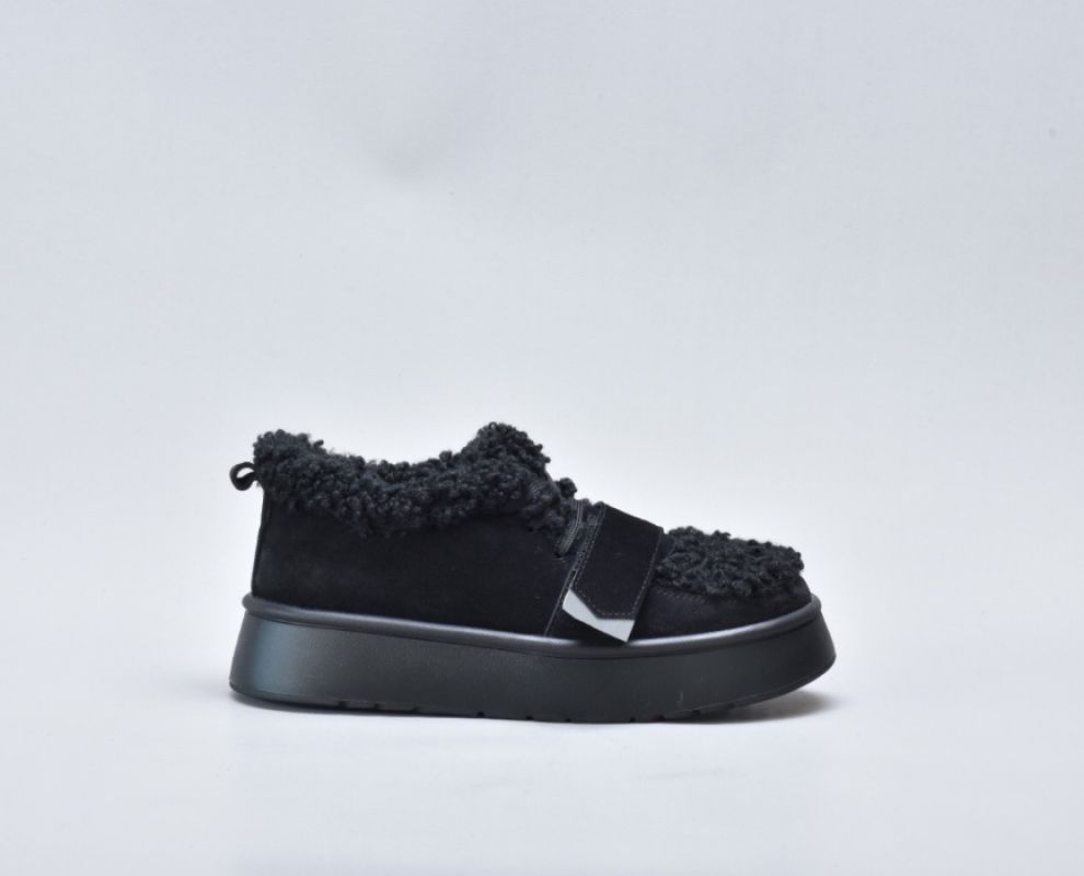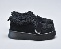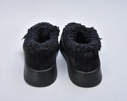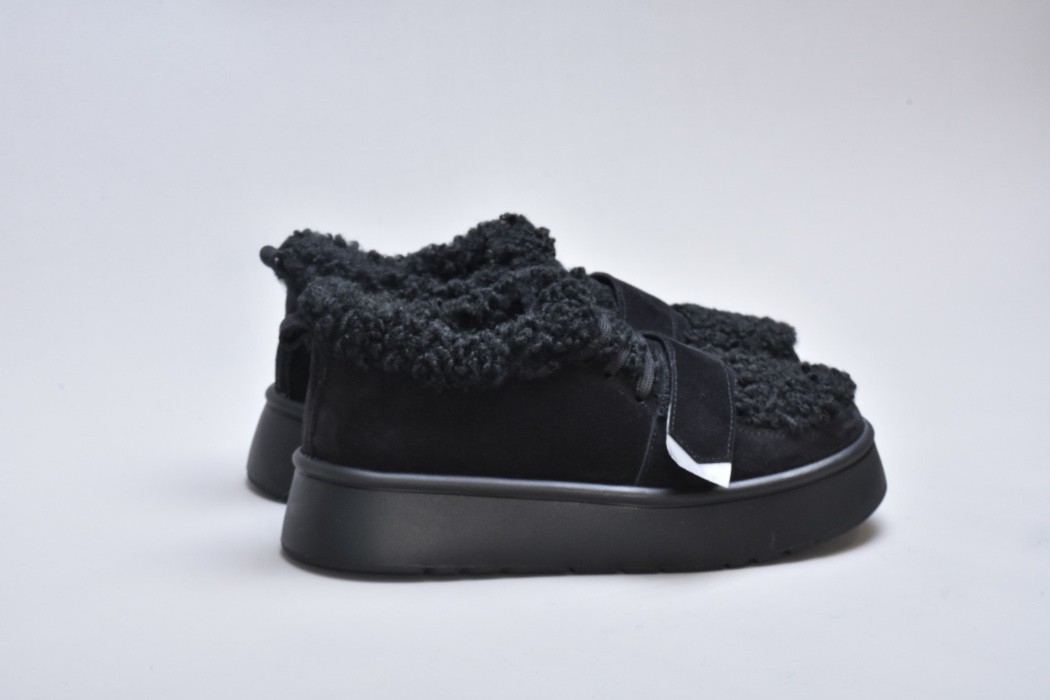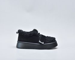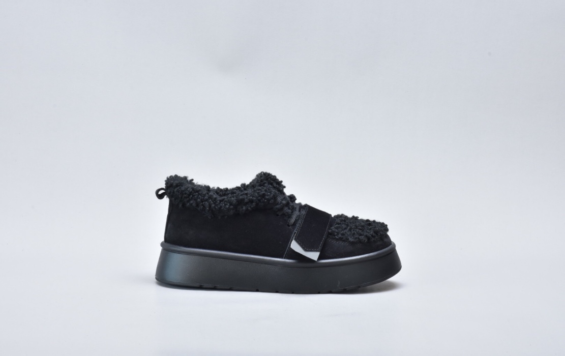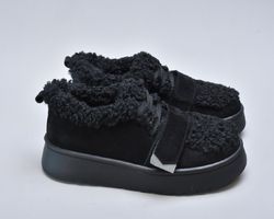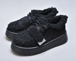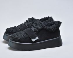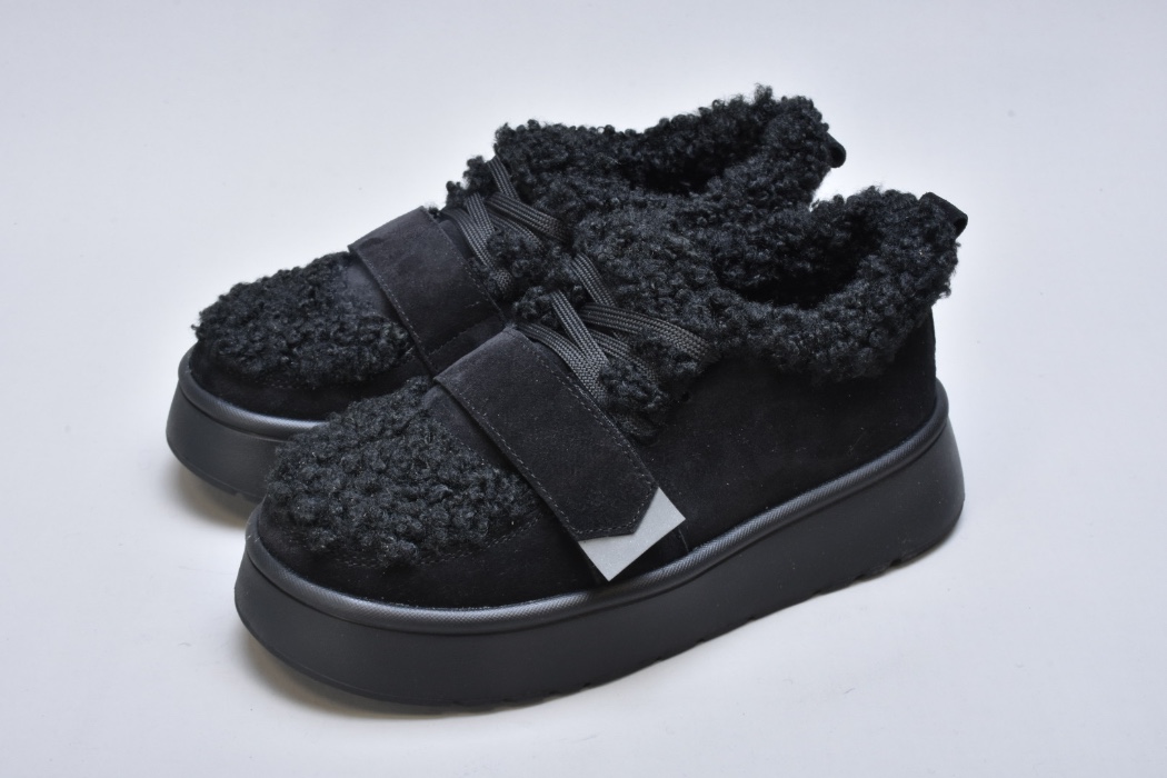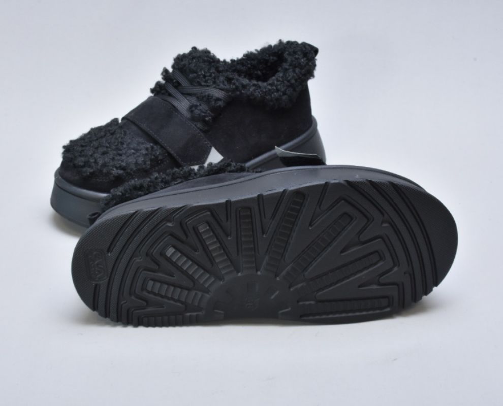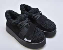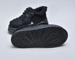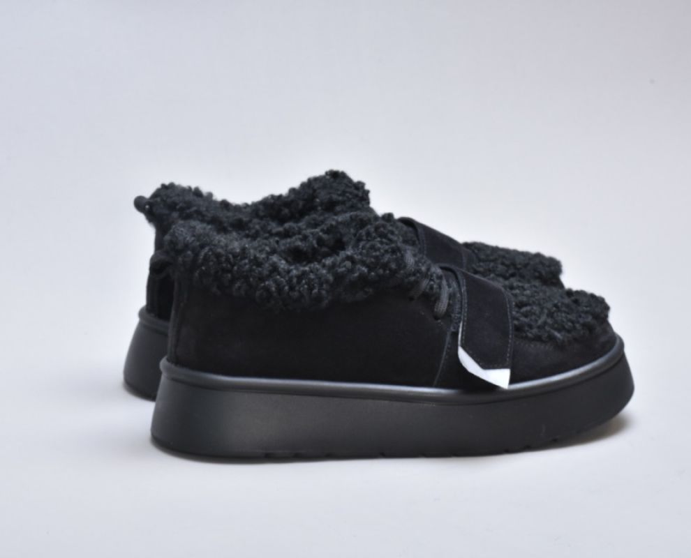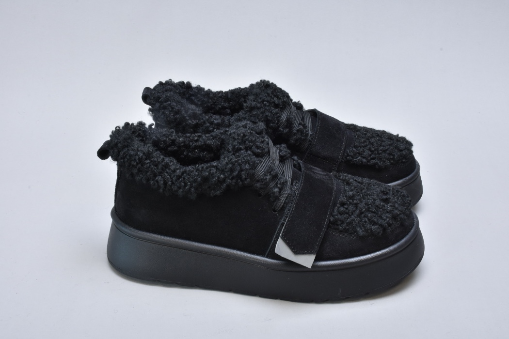 Оздоблення виконано з фактурного штучного хутра нового покоління, яке зовні нагадує натуральну овчину. Воно не лише додає моделі об’єму й візуальної м’якості, а й створює відчуття тепла та затишку. Завдяки високій щільності волокна хутро довго зберігає свій вигляд, не злежується та не втрачає форму. Така фактура надає черевикам дизайнерського характеру й робить їх справжнім акцентом зимового образу.